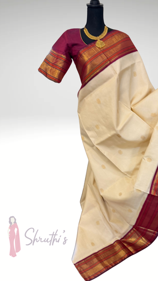 Pure Ven pattu saree White Cream and Red pure zari kanjivaram silk saree with prestitched blouse