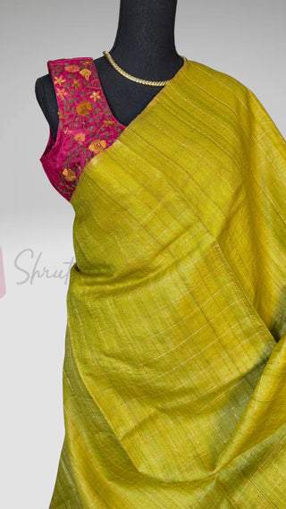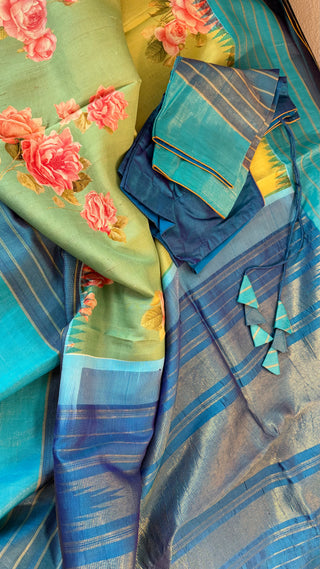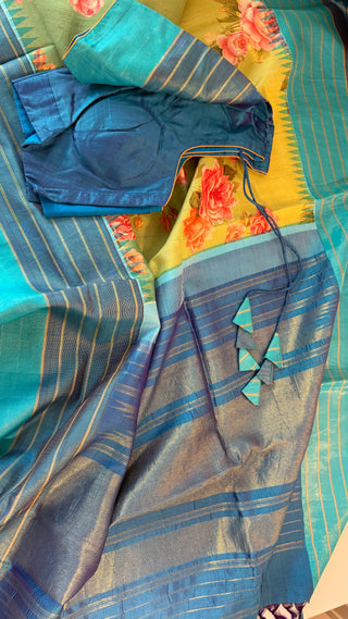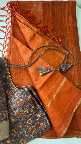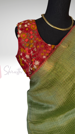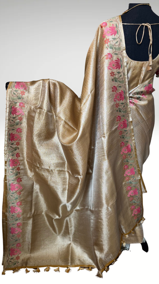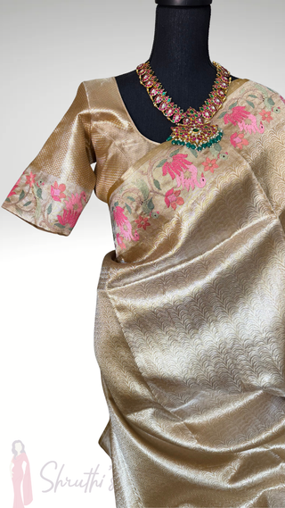 Tissue Gold Chanderi pastel tissue silk saree with pen kalamkari hand embroidered silk blouse
