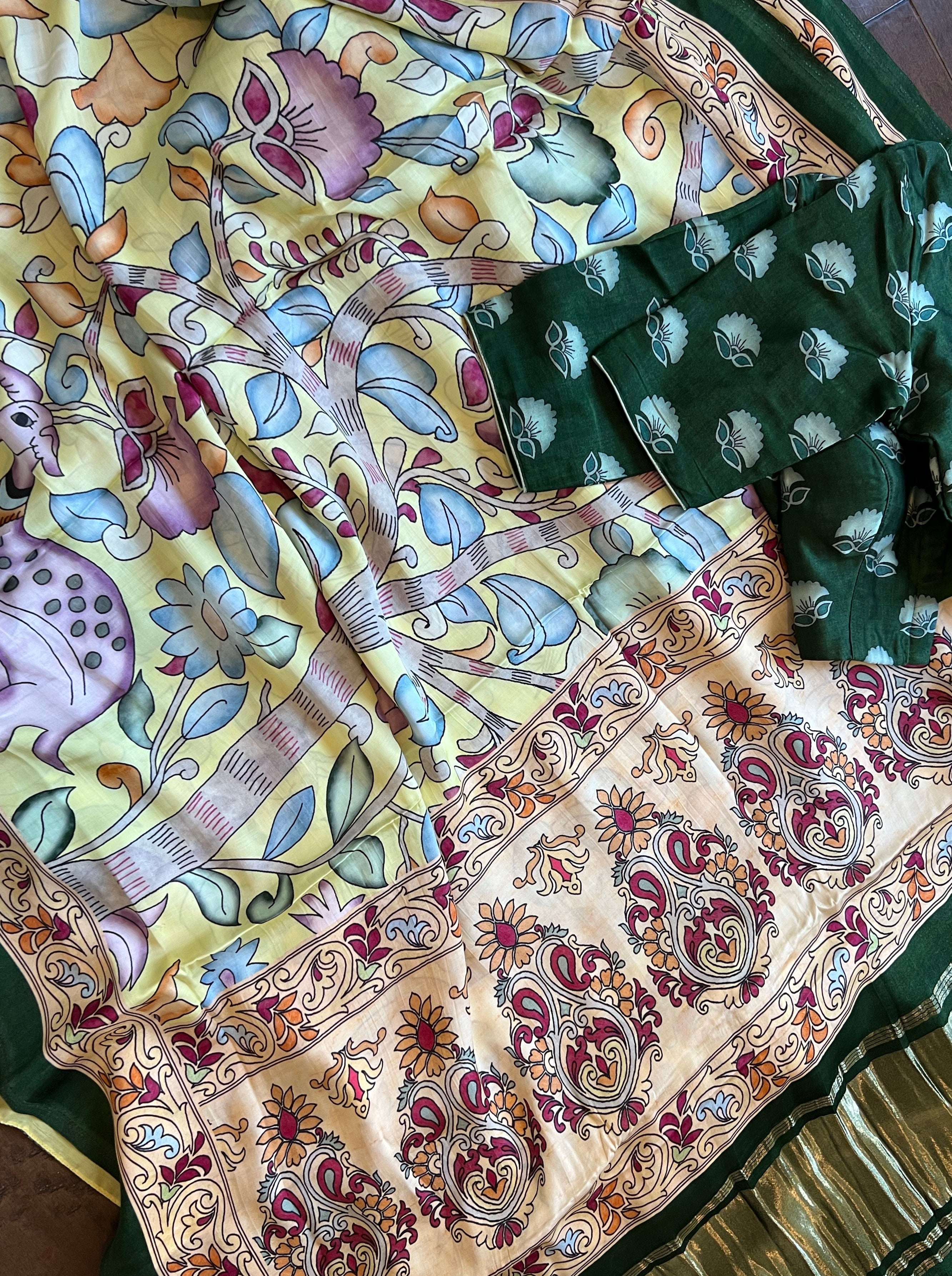 Kalamkari printed gajji silk saree with Printed zari and pallu prestitched blouse
