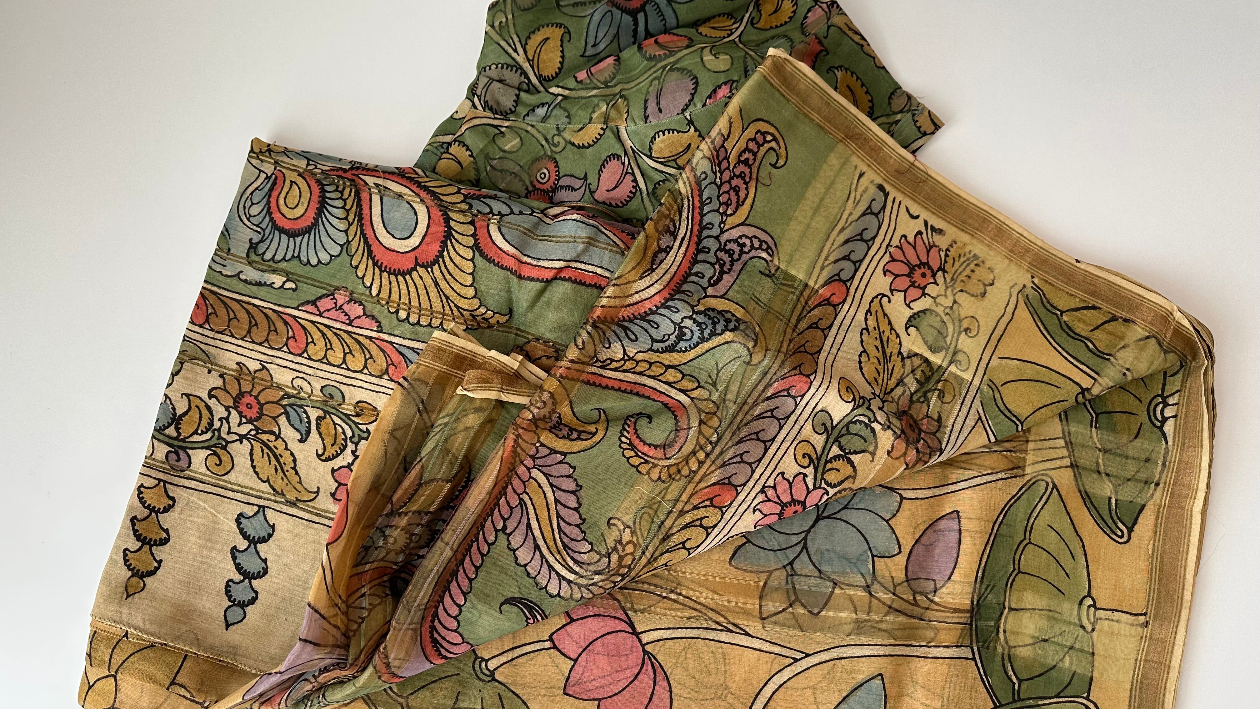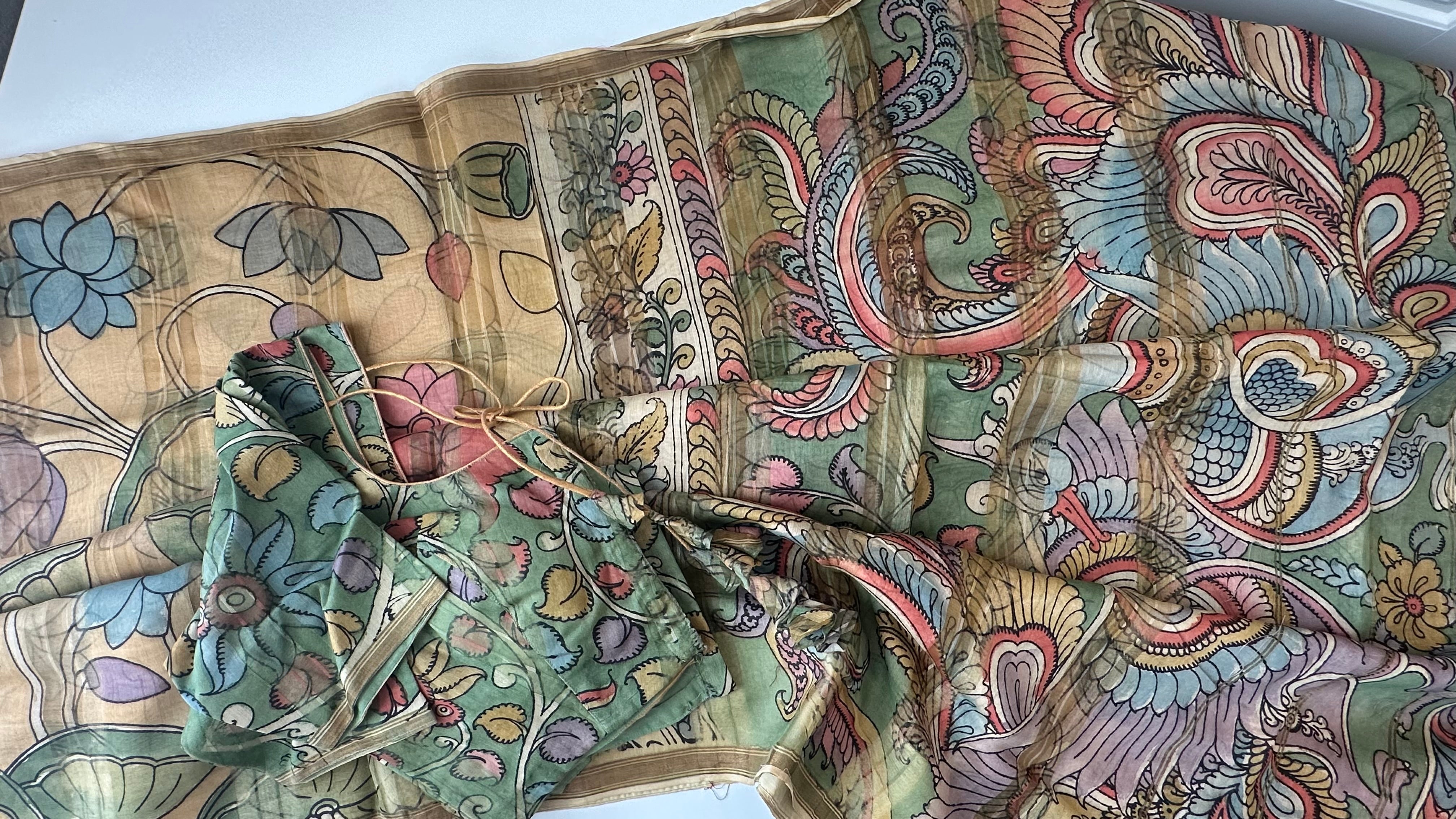 Green pure pen kalamkari    saree online usa with stitched blouse Partywear Indian hand painted saree with blouse .