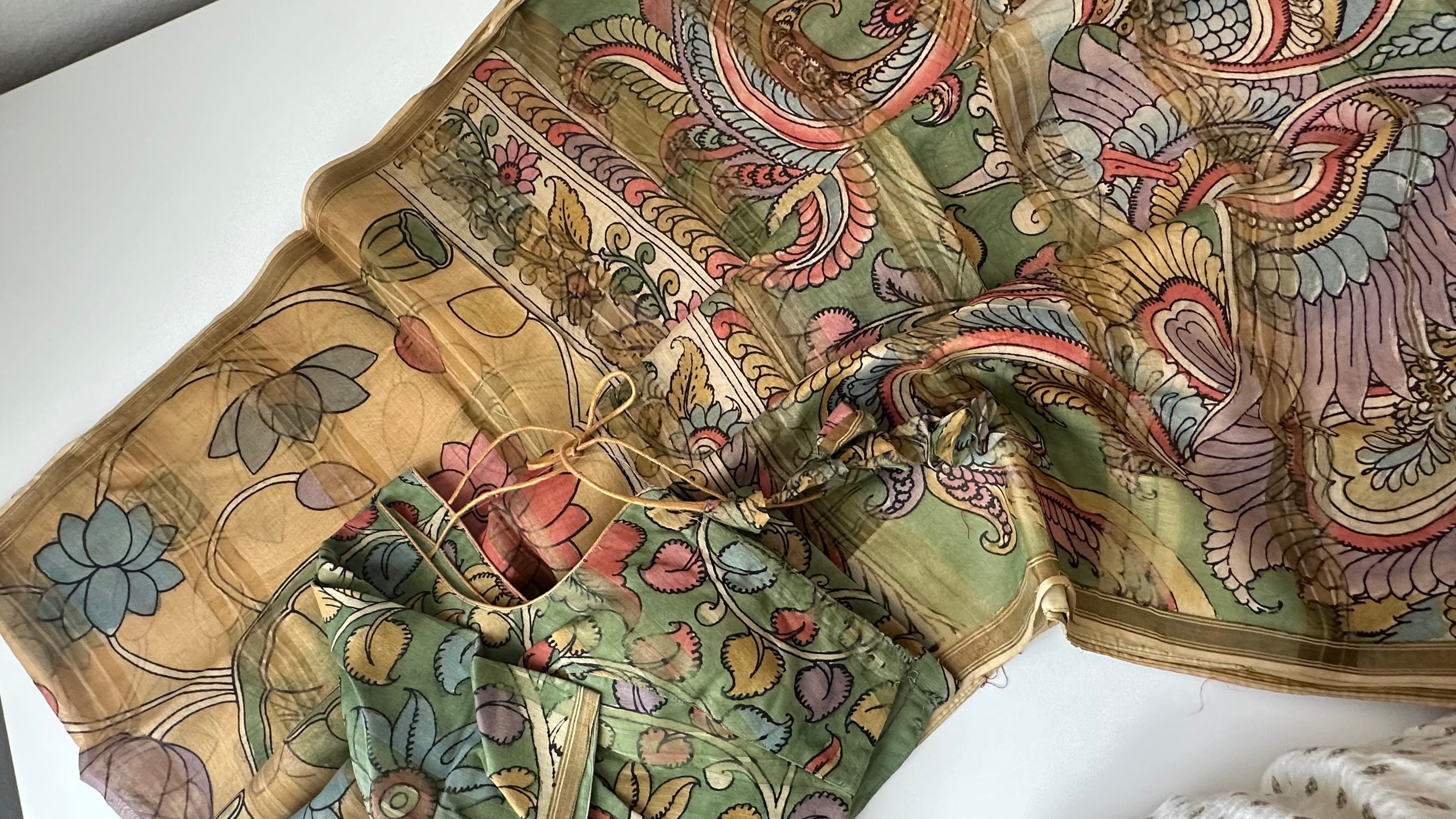 Handpainted saree Indian Pen Kalamkari saree online usa with stitched blouse Partywear saree