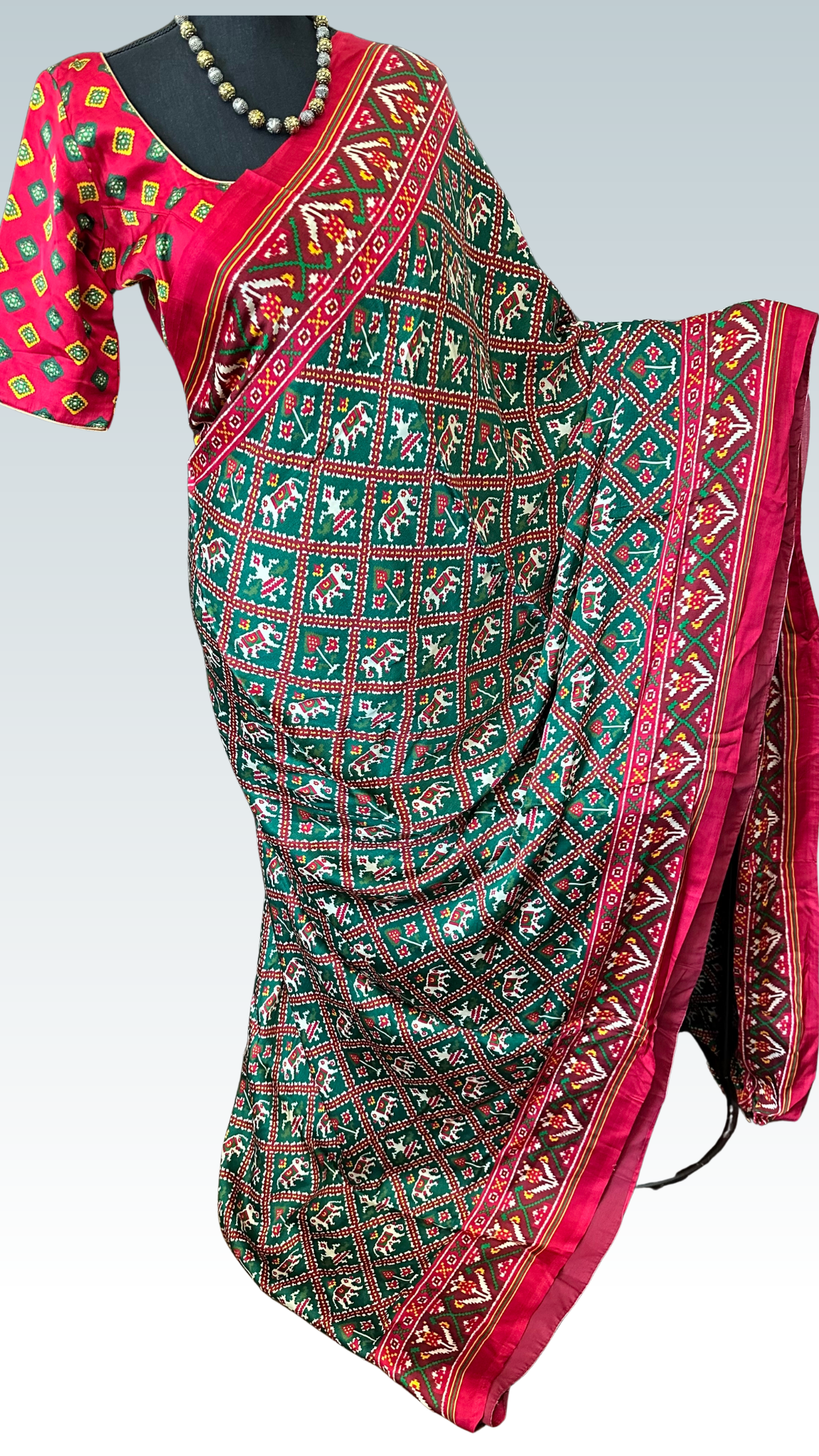 Satin crepe pure gajji silk saree with prestitched blouse ikat prints..
