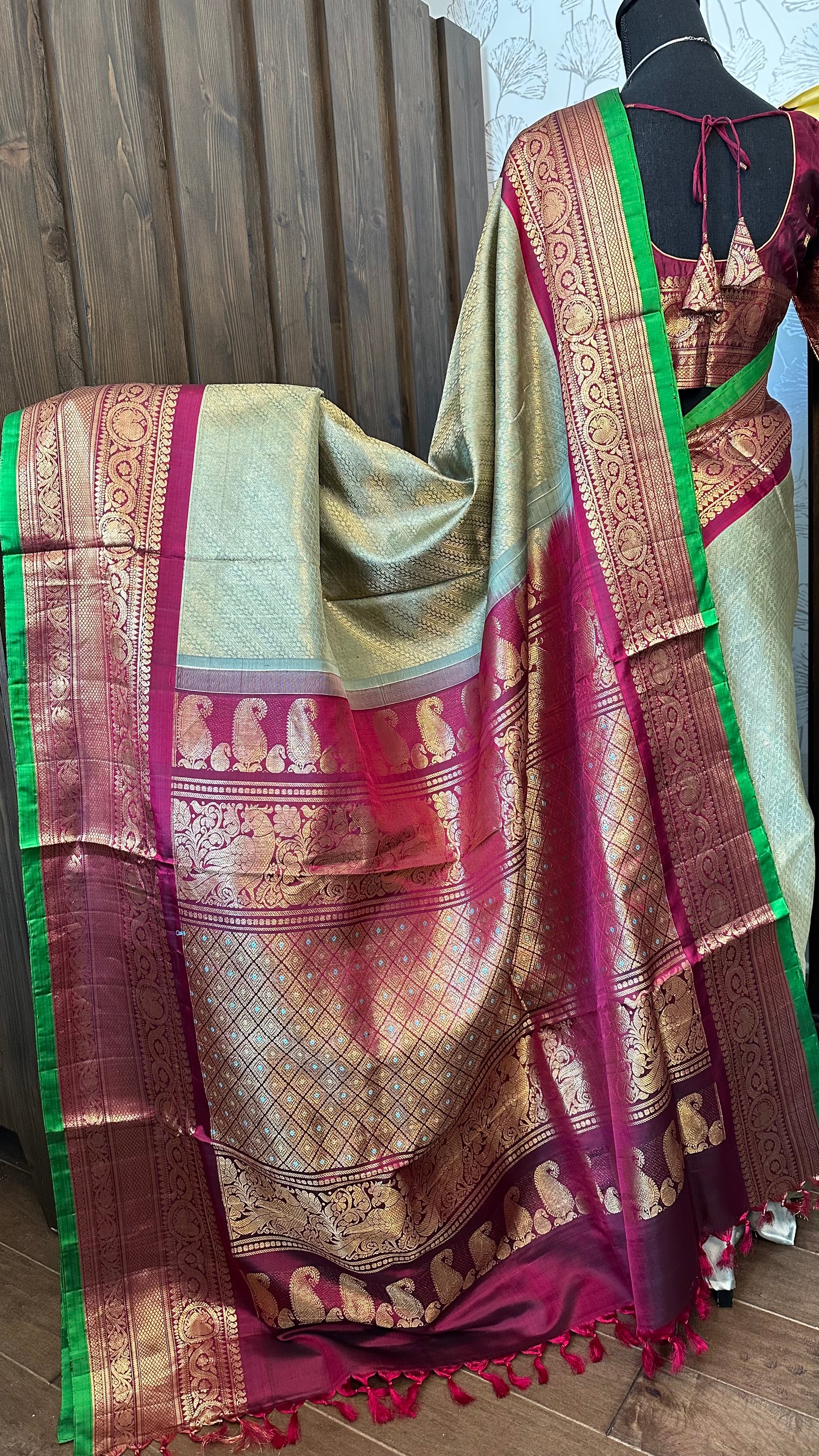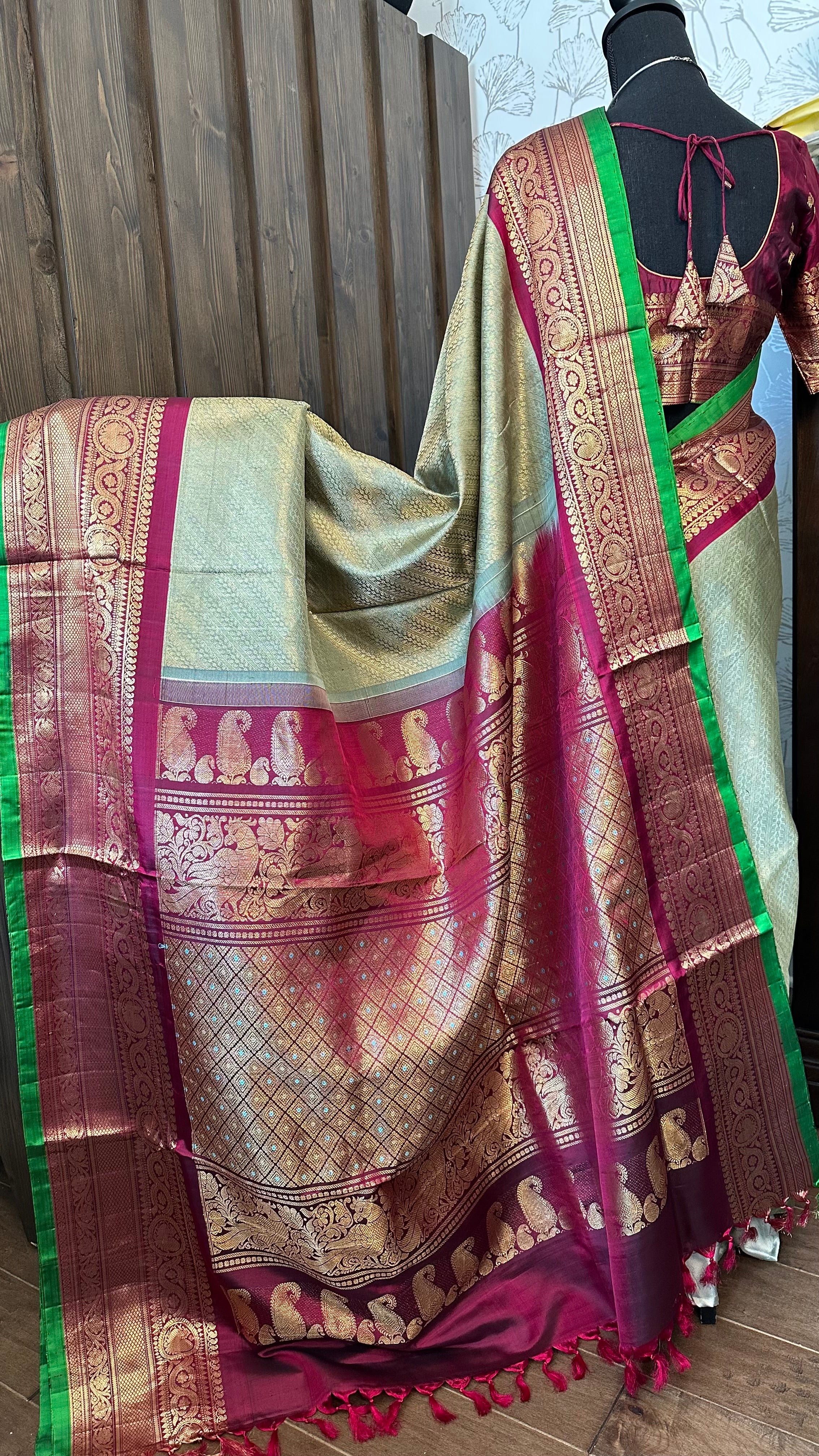Experience the grandeur of heritage with this Pure Gadwal Silk Saree in a stunning olive green to maroon  dual-tone combination, enriched with intricate gold zari weaving. Crafted from premium handloom silk, this saree showcases the renowned Gadwal craftsmanship, known for its lightweight feel and luxurious drape.