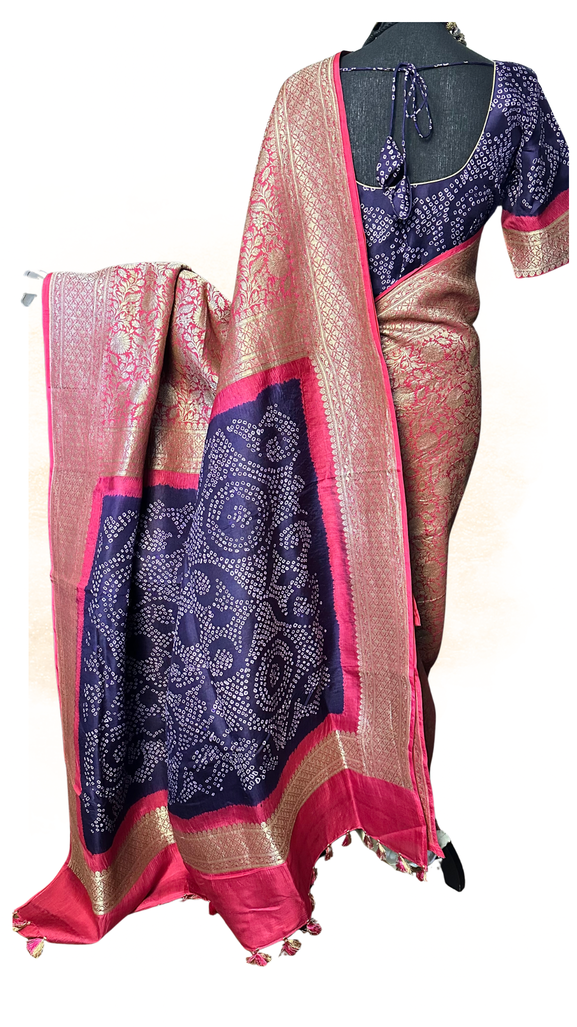 Expertly crafted from pure silk, this Benerasi Bandhani saree is a beautiful addition to any wardrobe. Featuring intricate tear drop motifs and handdone cOne zari details, this saree exudes elegance and sophistication. The pure zari silk borders and pallu add a touch of luxury and the stitched blouse ensures a perfect fit. Imperfections in the handdone Bandhani design are a testament to its authentic, handcrafted nature. Elevate your style with this pure silk saree.Pure purple bandhani paithani silk saree online usa