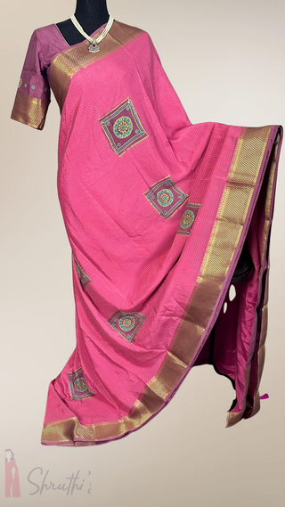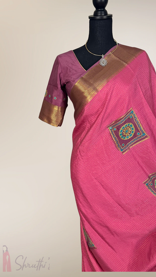 Printed soft silk double ply saree online with Hand embroidered prestitched blouse