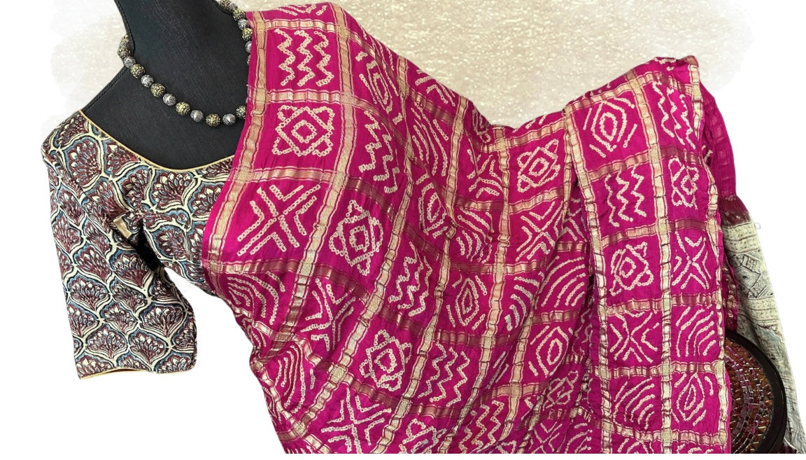 Pink bandhani silk saree ajarakh pallu bandini Gajji silk with blouse