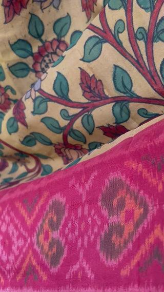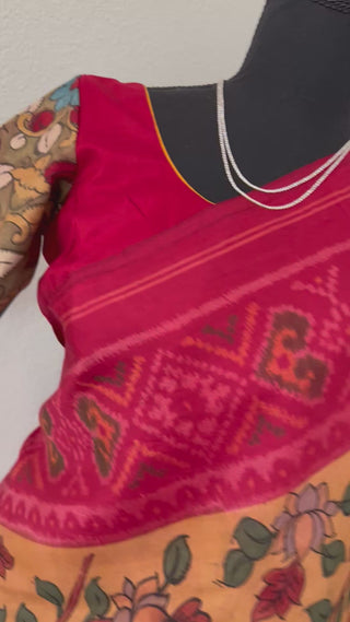 Introducing our exquisite Patan patola hand painted kalamkari silk saree in a beautiful shade of pink. Made with pure vegetable dyes and adorned with intricate hand painted designs, this saree is a true masterpiece. Experience the elegance and luxury of pure patan patola silk, now available online in USA. Pure silk saree. Comes with stitched blouse , stitched blouse at 36 goes upto 42/43. Alterations /video calls can be requested.