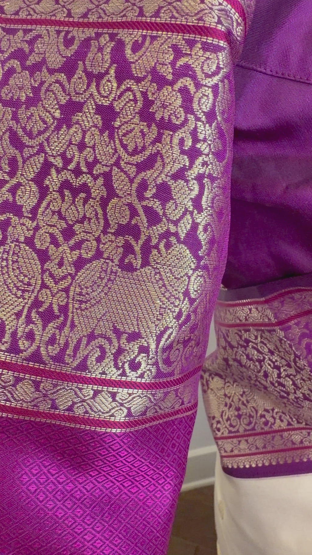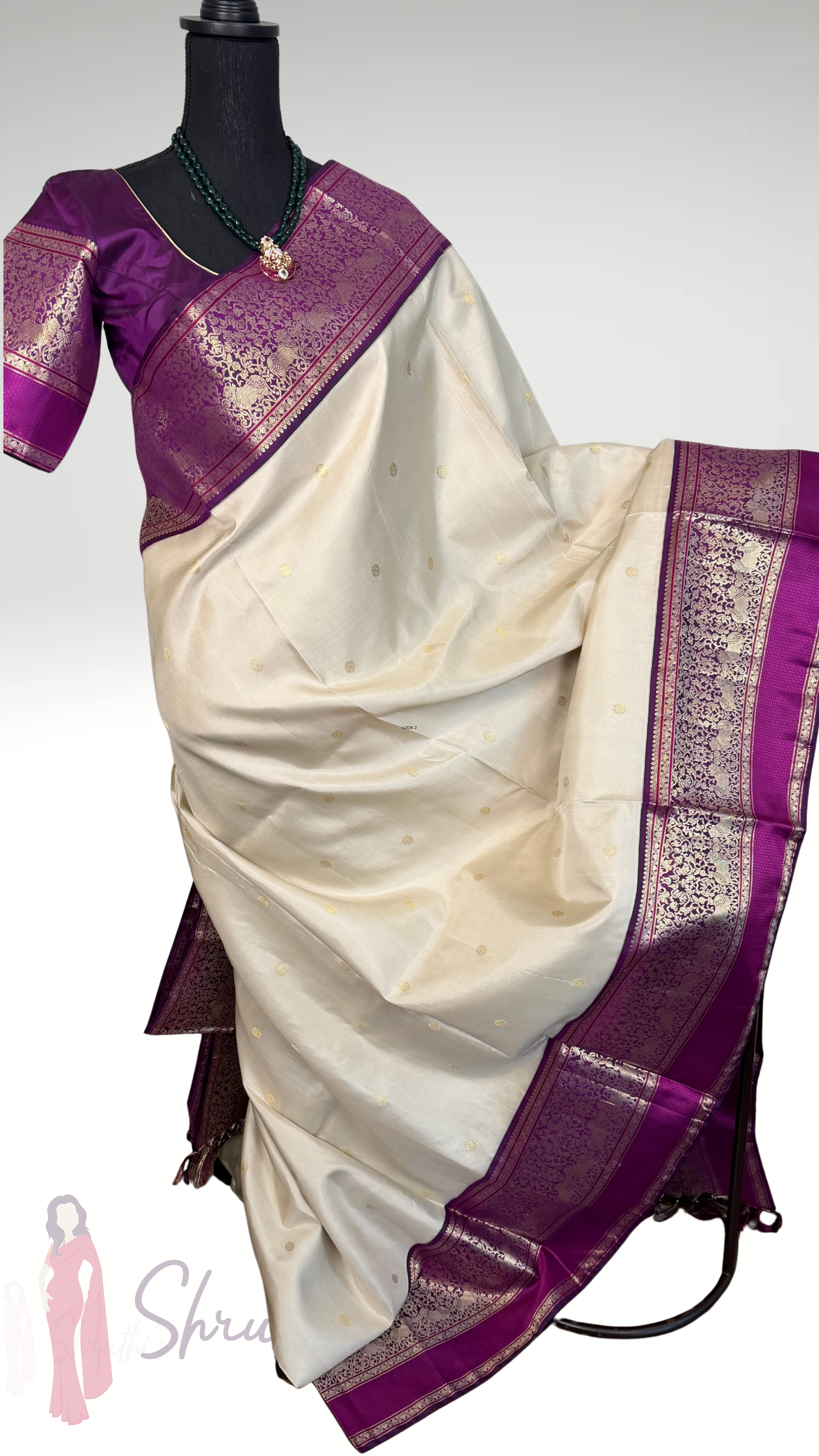 Beautiful cream and purple border heavy pallu (wedding collection) pure zari kanjivaram silk saree with prestitched blouse