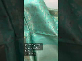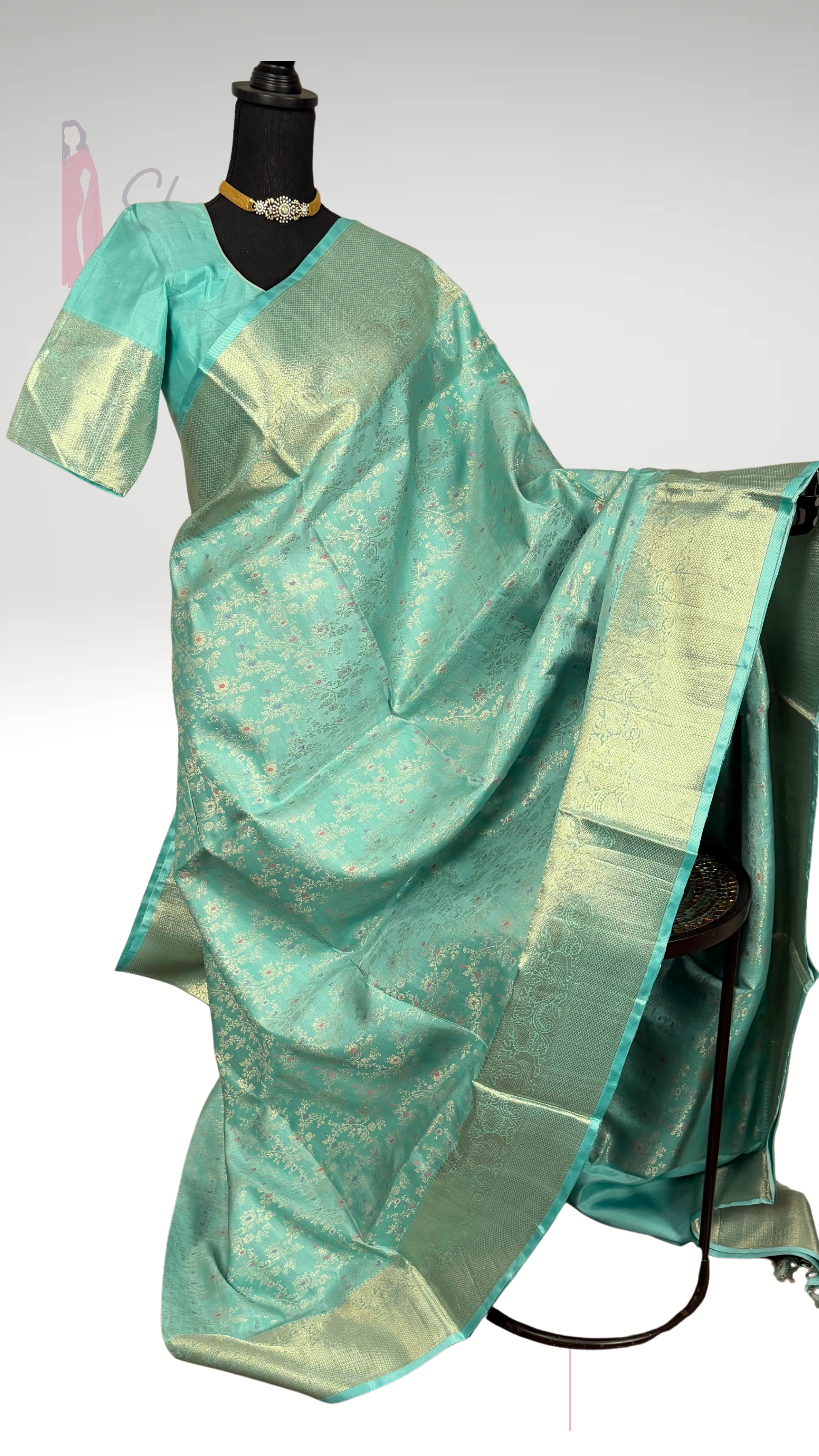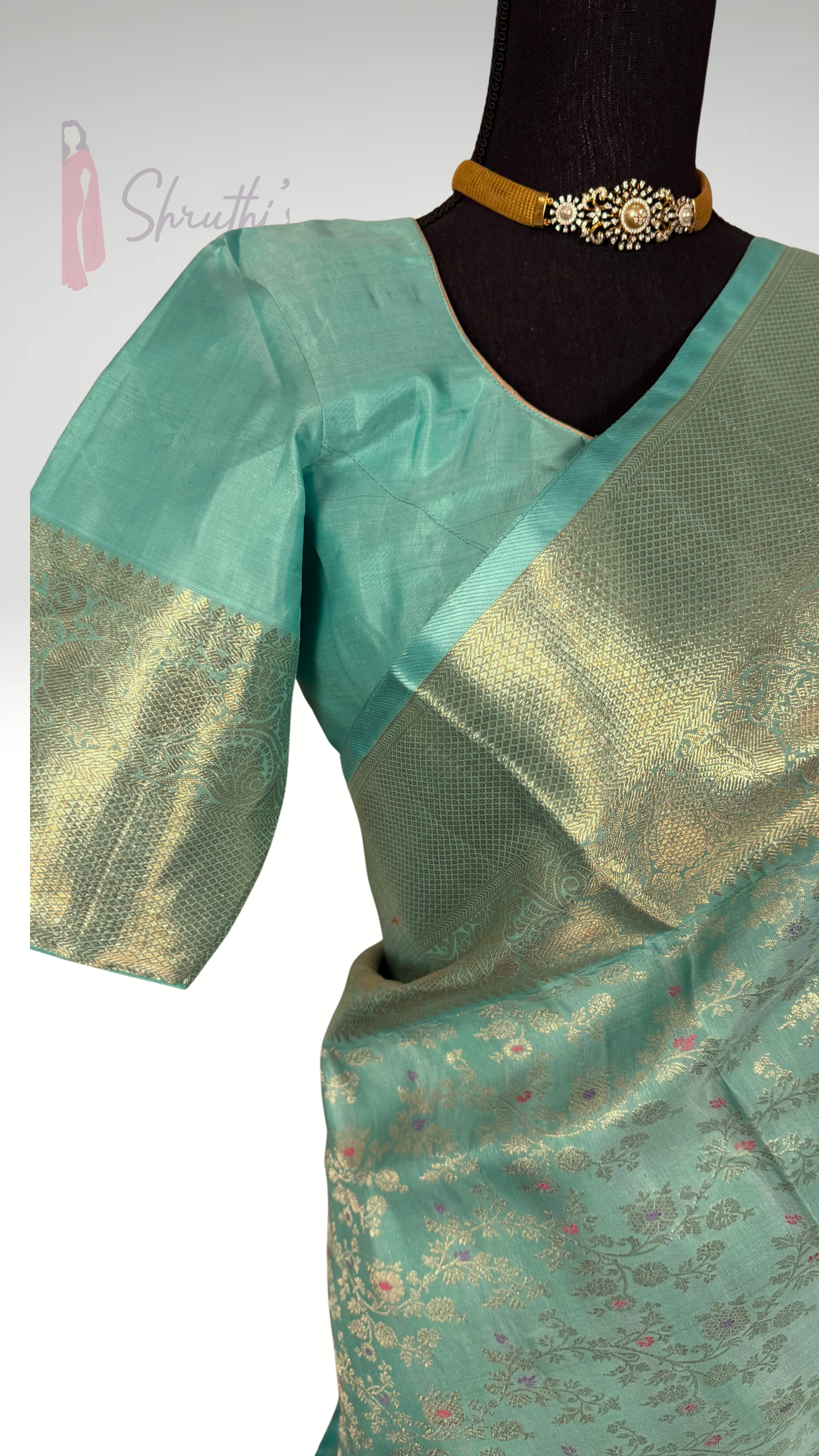 one of a kind Brocade Kanjivaram with hand woven design , comes with prestitched blouse with hand embroidered designs.