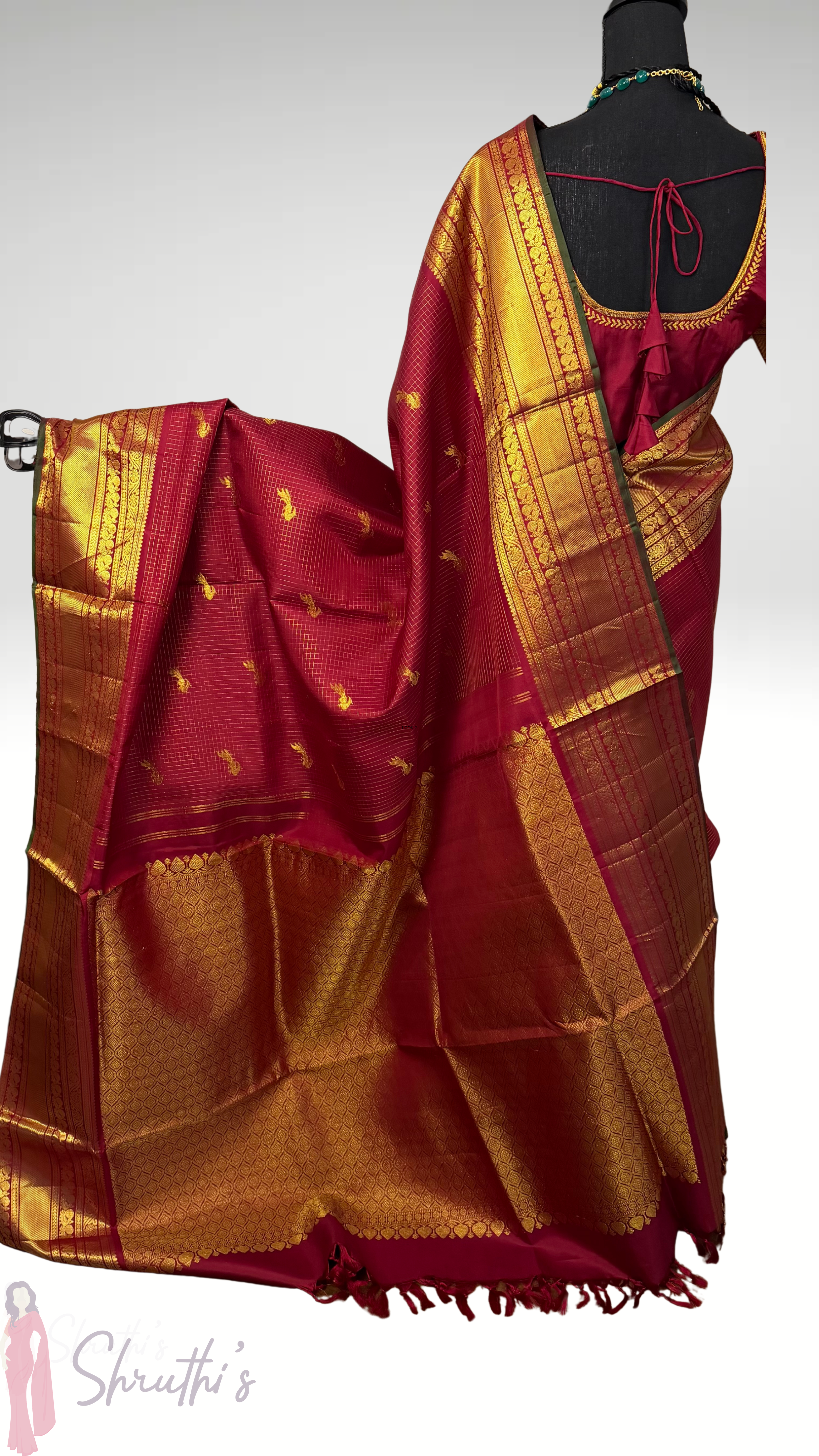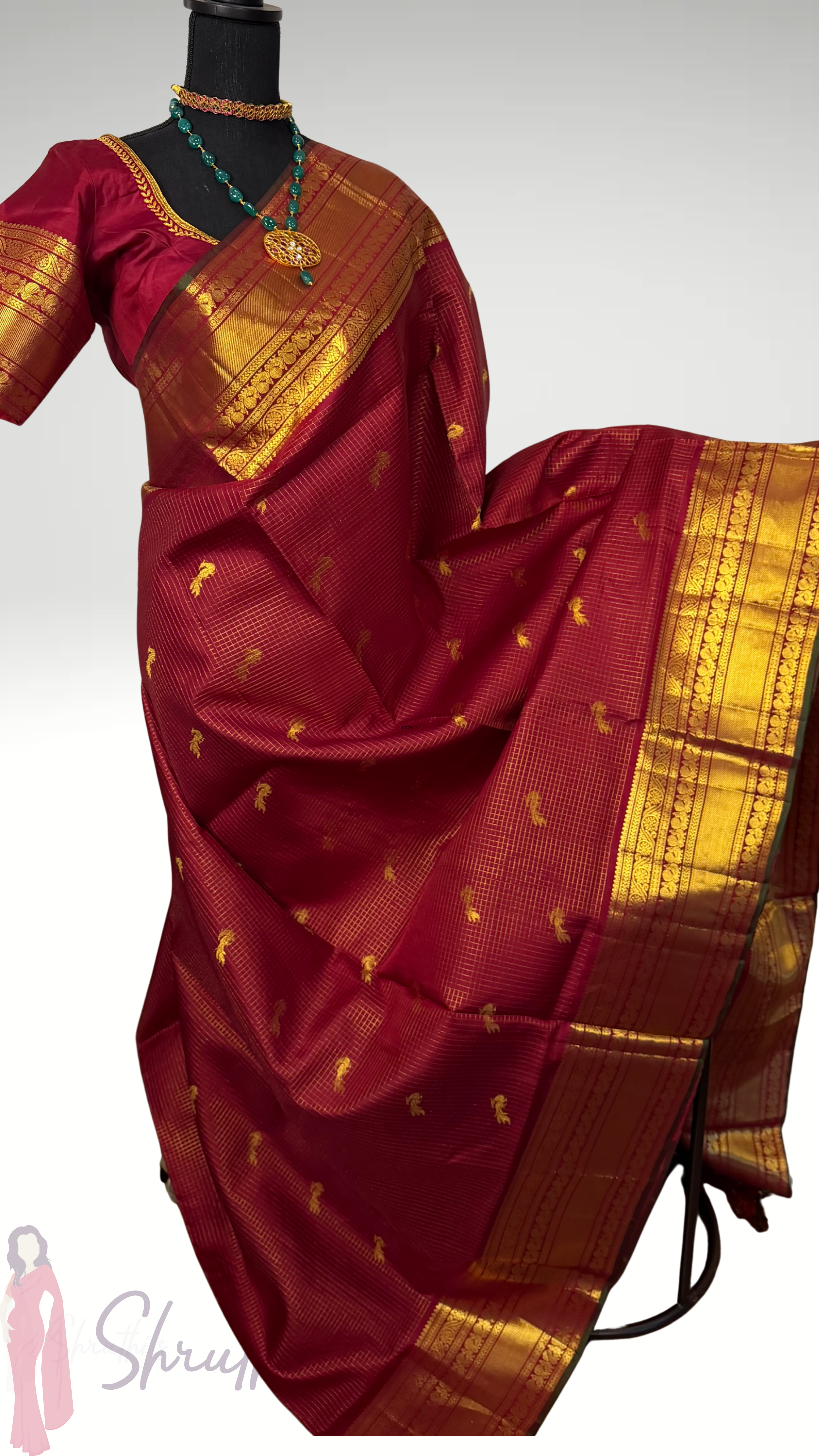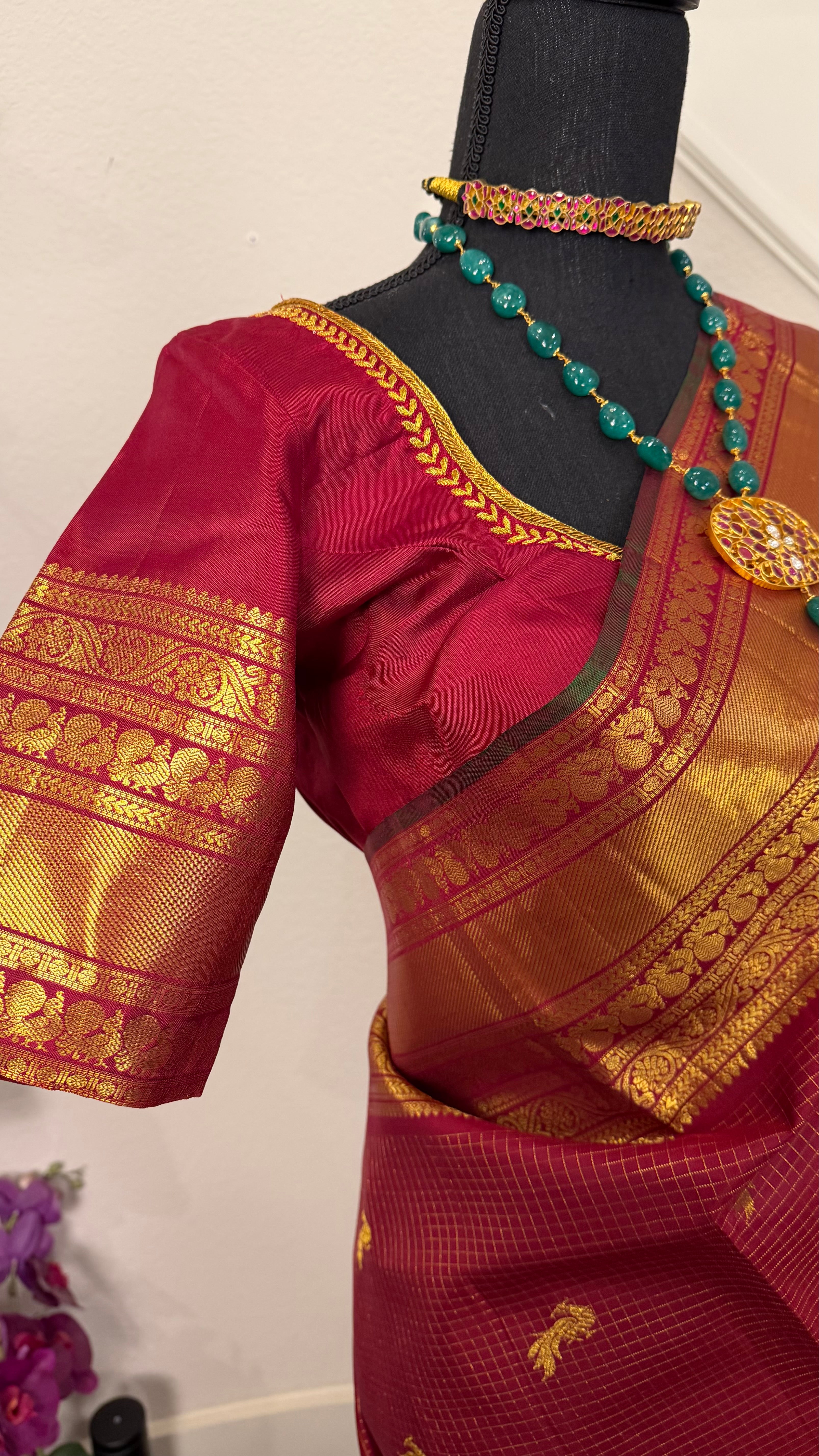 Handloom pure kanjivaram muthu kattam check’s deep maroon with stitched blouse .
