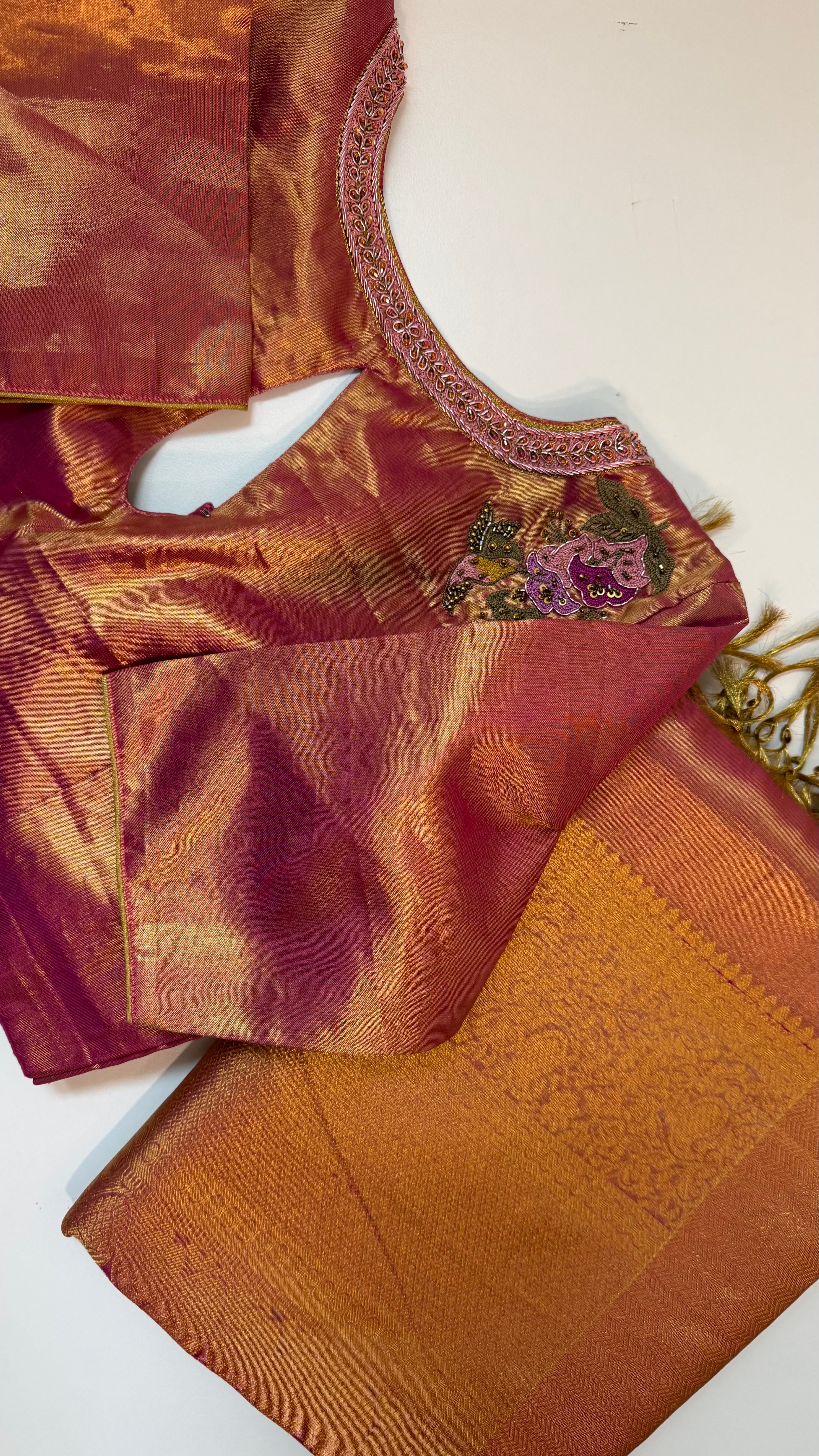Fine weave kanjivaram zari with hand embroidered blouse saree,Bridal tissue kanchi pattu saree online muhurtham saree online.
