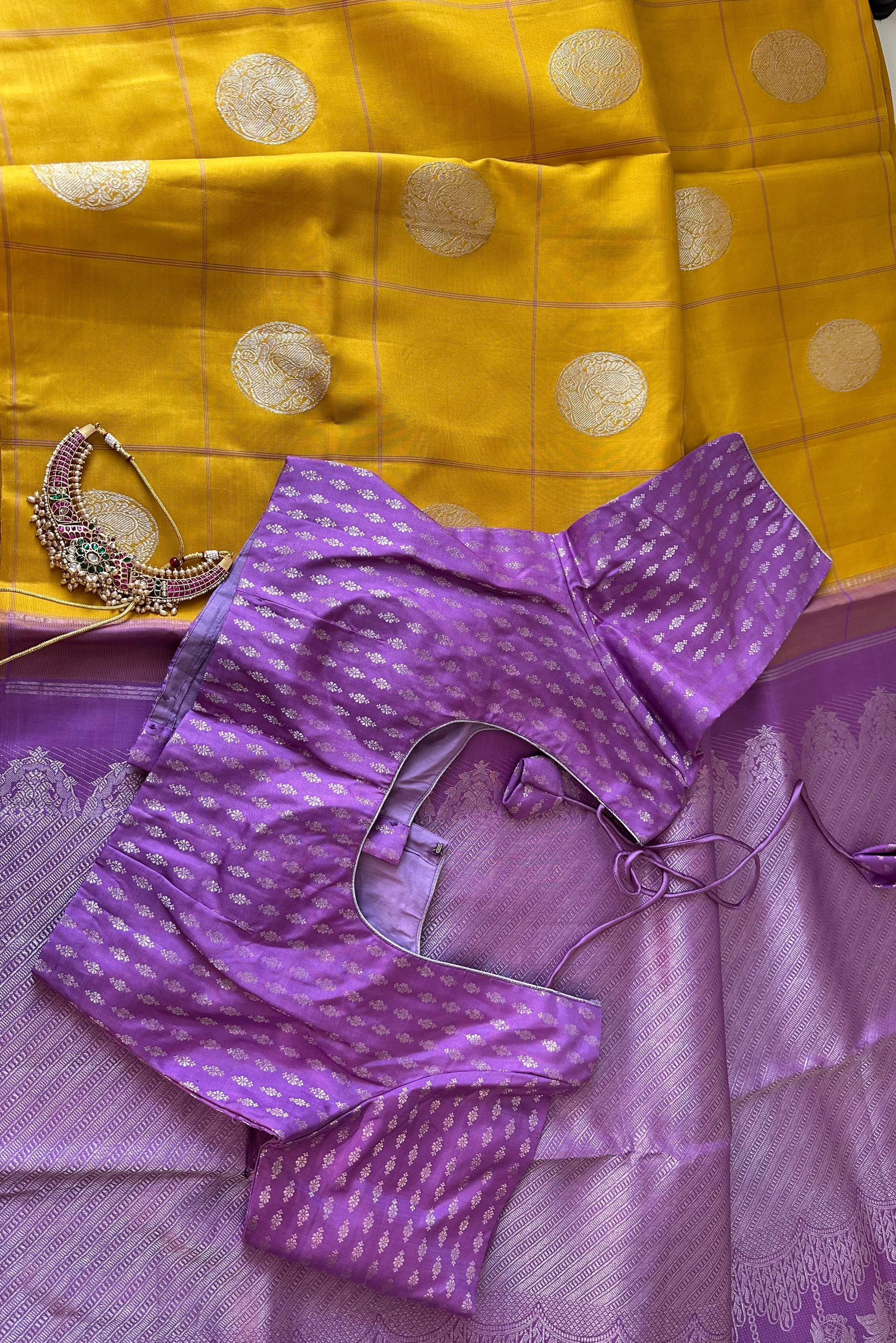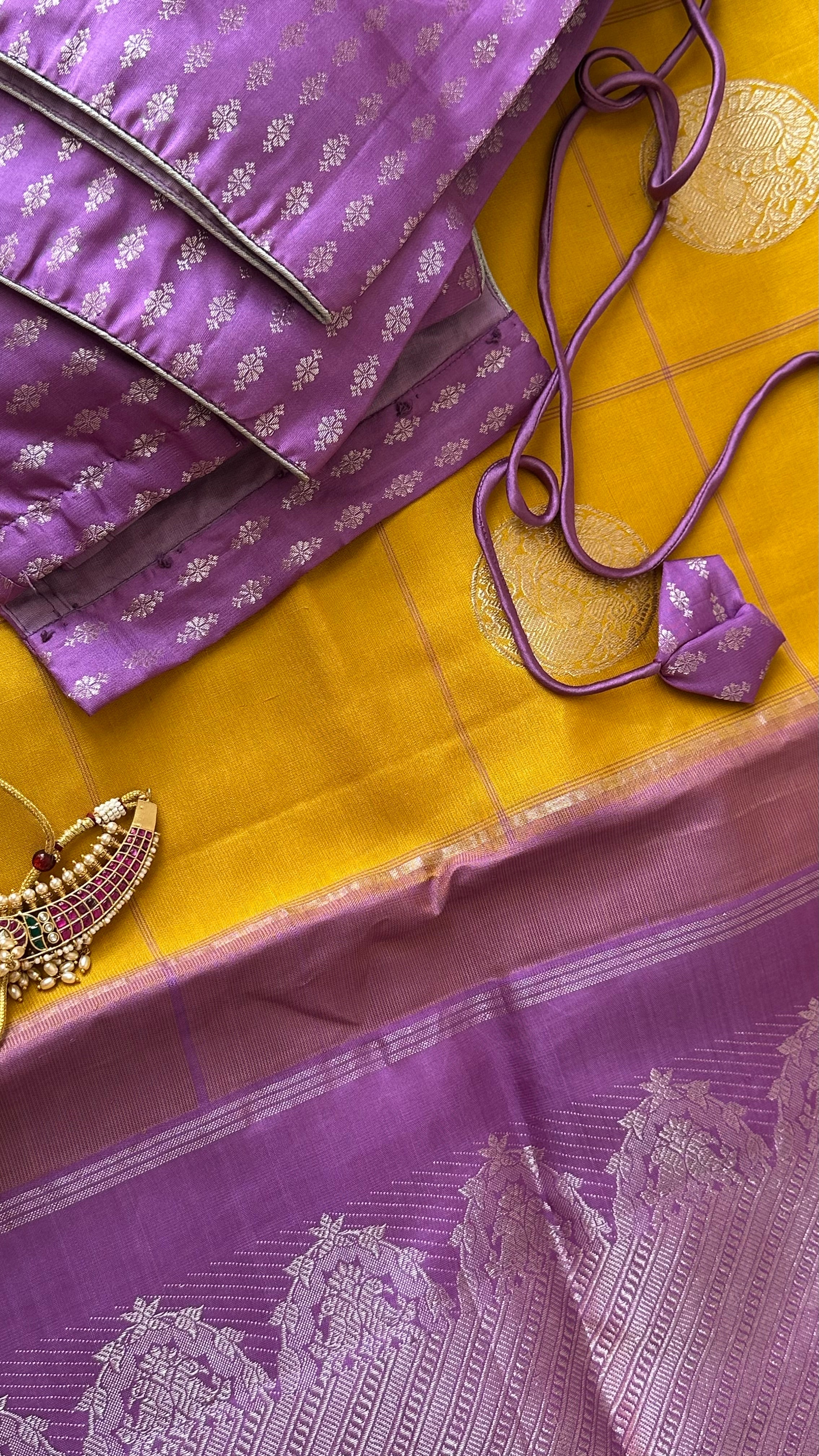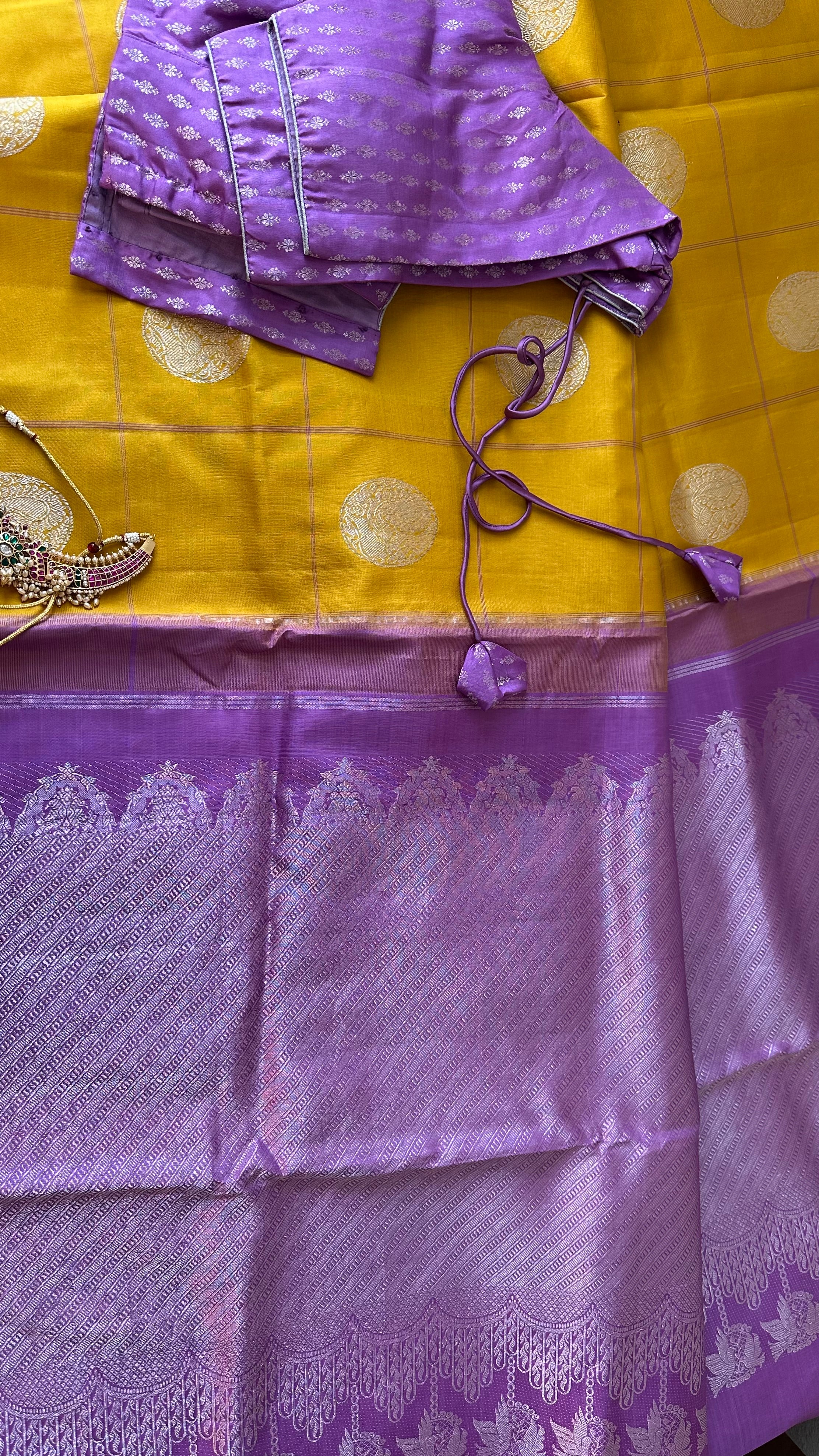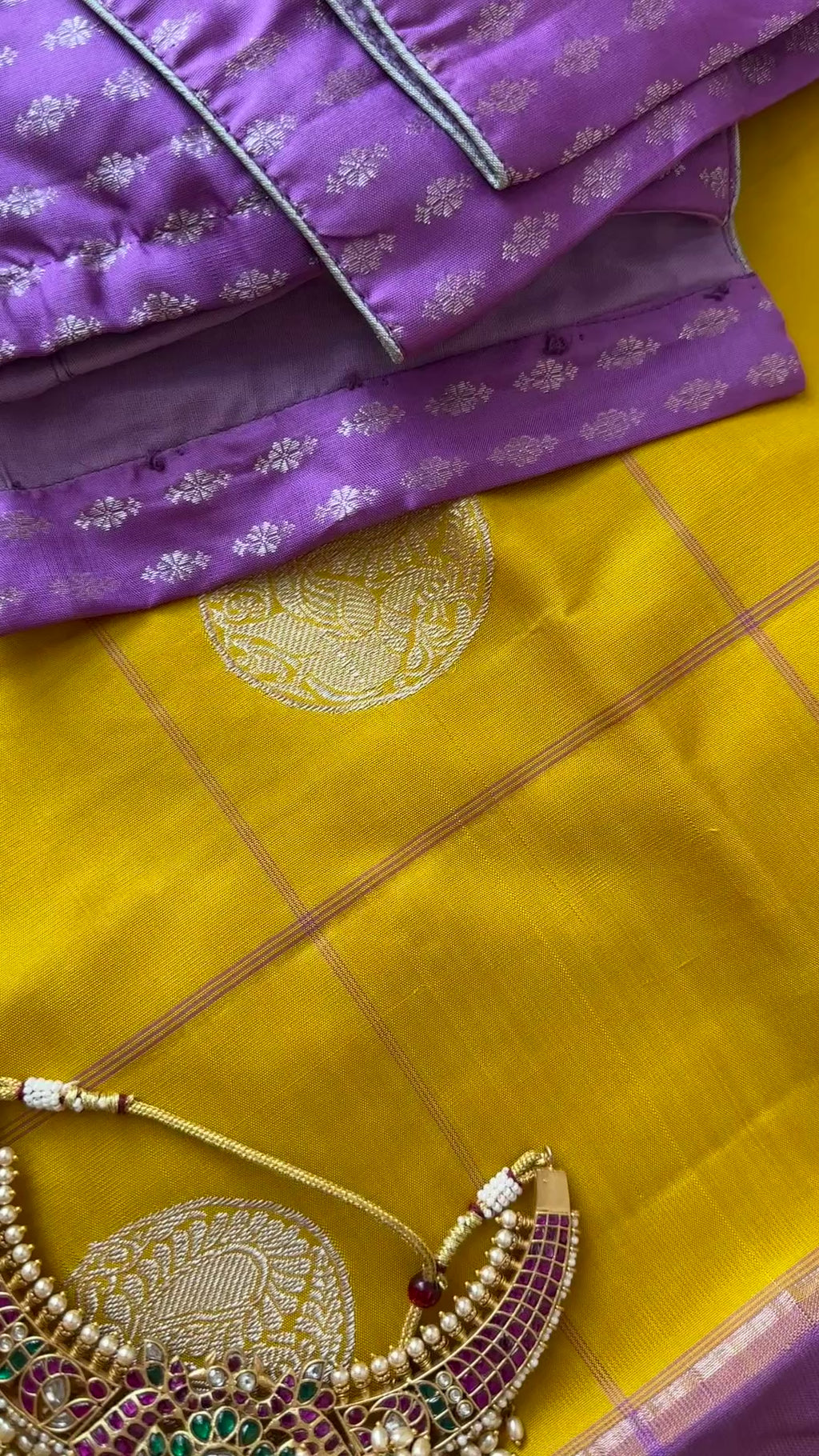 Expertly crafted with handwoven beauty, this borderless yellow kanchi pattu saree features pure zari for a touch of elegance. The fine weave and easy drape make it a breeze to wear, while the stitched blouse adds a perfect finishing touch. With alterations available and video calls for assistance, this saree is a must-have for any occasion.Borderless kanjivaram pattu saree with silver zari