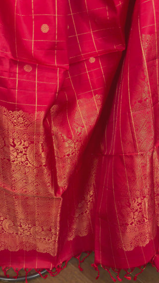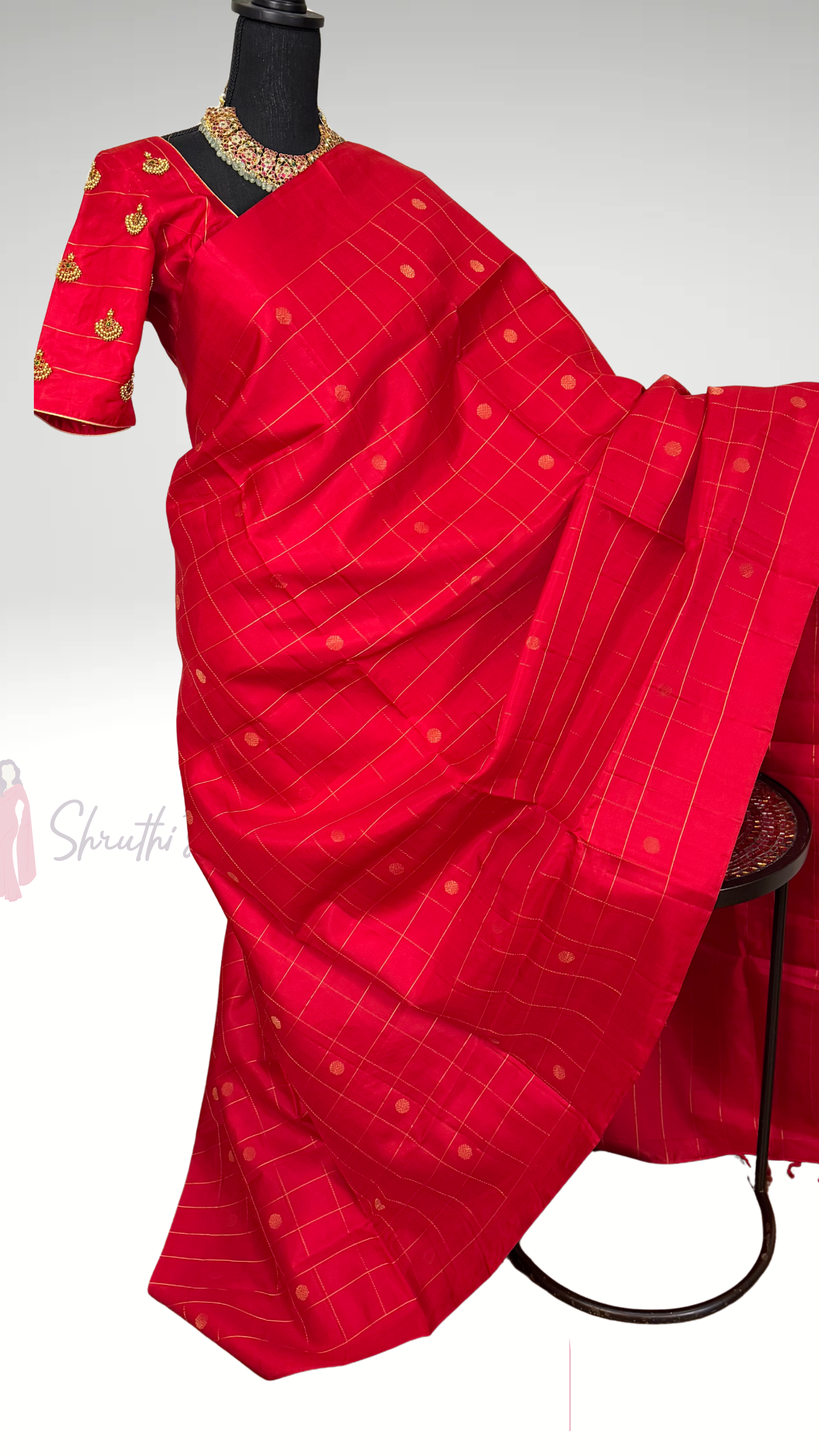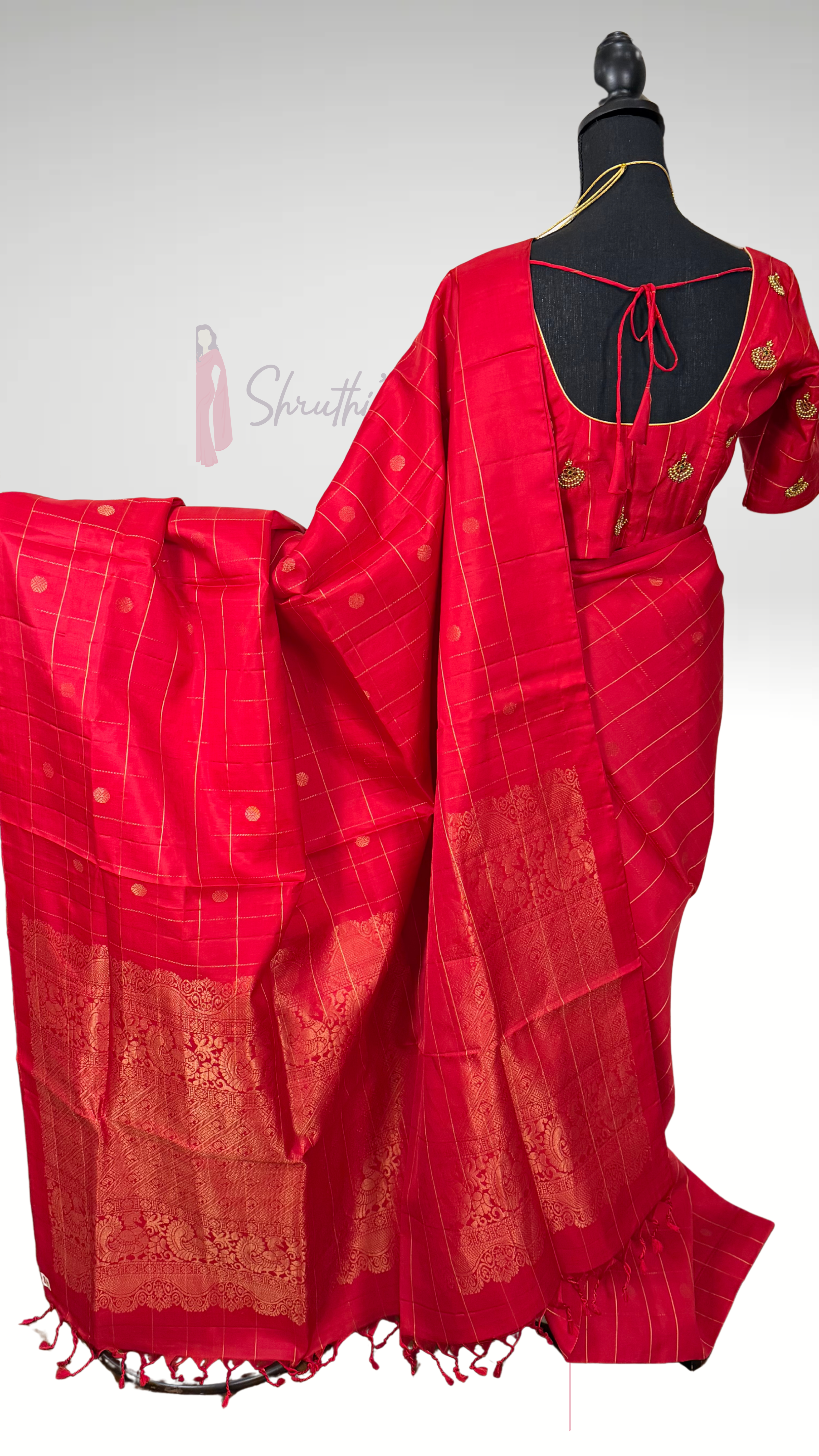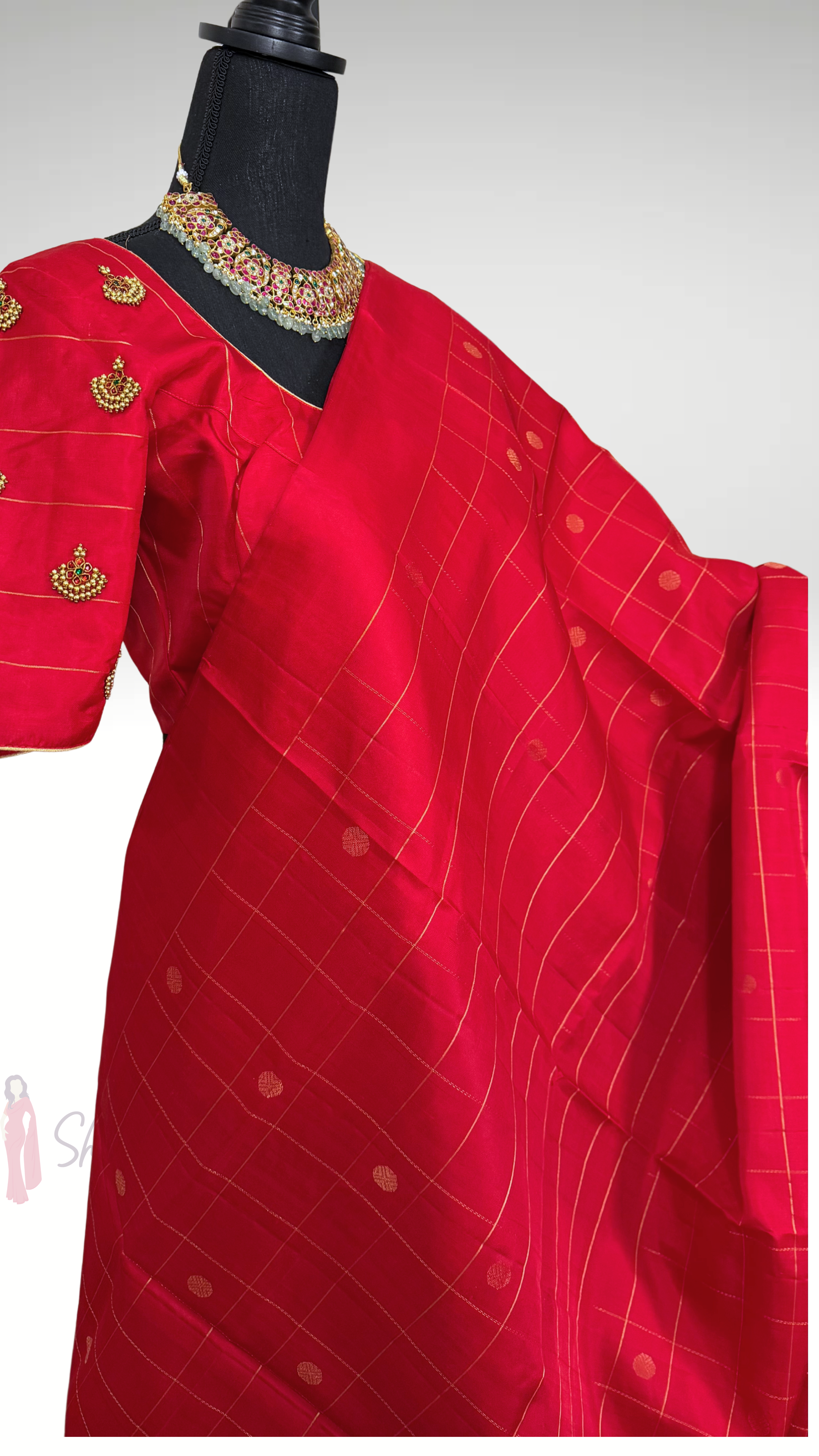 Discover the elegance of this pure soft silk saree in a serene REd chili Red gradient, blending gold hues with exquisite craftsmanship. Featuring a delicate gold zari border and fall pico detailing, the saree drapes gracefully for a heavenly silhouette. It comes ready to wear with a stitched blouse tailored to size 36, adjustable up to 43/44 for a perfect fit. Ideal for special occasions, this saree combines luxurious comfort with timeless sophistication.