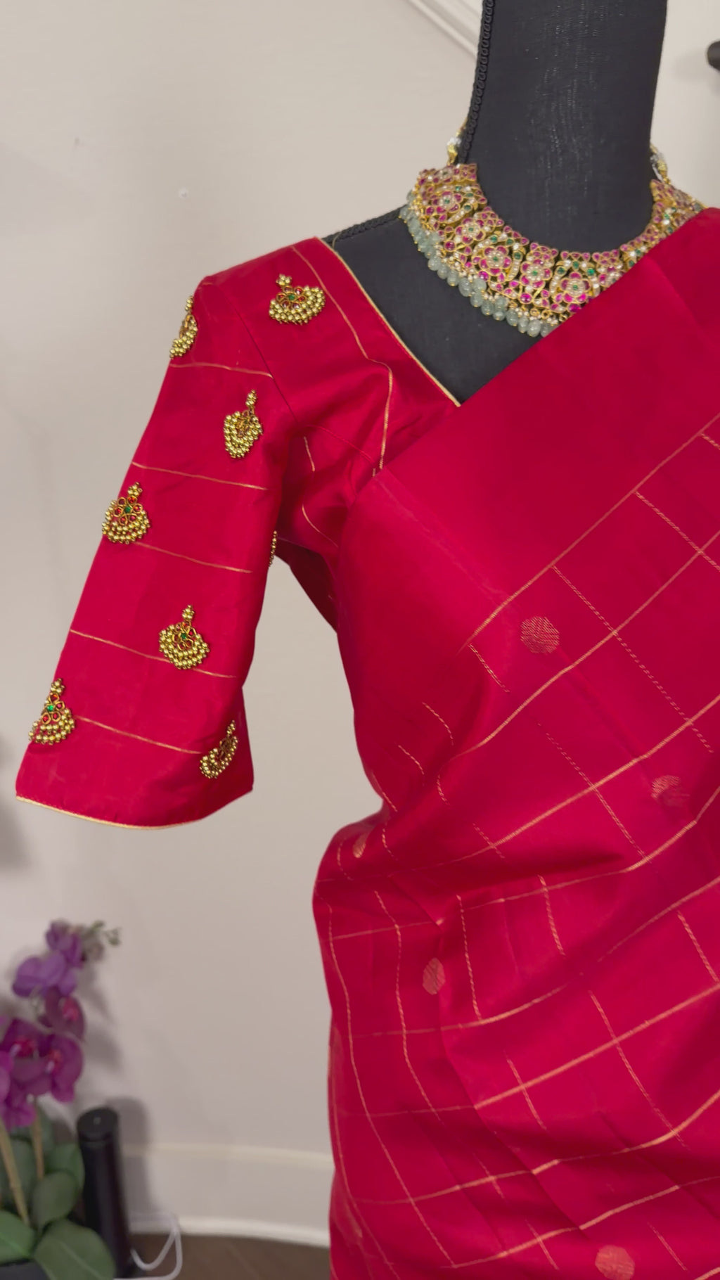 Saree with highest quality fabric zari, stitched blouses with hand embroidered designs( not all) . Well made blouses. Pico fall done Product ships free USPS priority mail.