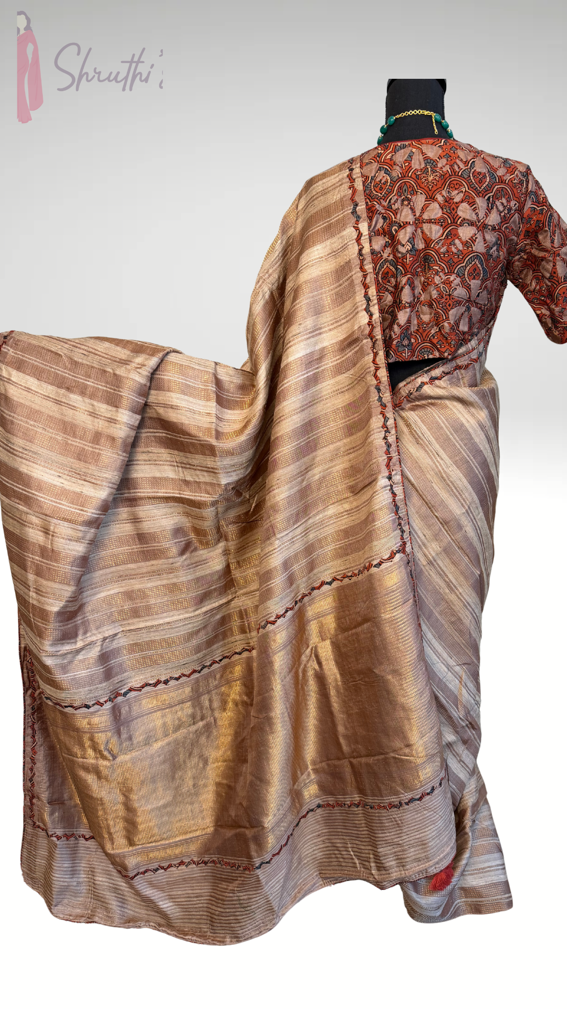 Expertly crafted from pure Handloom Tussar gold zari silk, this saree showcases a stunning floral design border embroidered borders, perfect for any occasion. The prestitched blouse can be easily altered for a personalized fit, making it an effortless choice for USA online video calls. Experience the luxurious feel of this saree with our user-friendly draping tutorial.