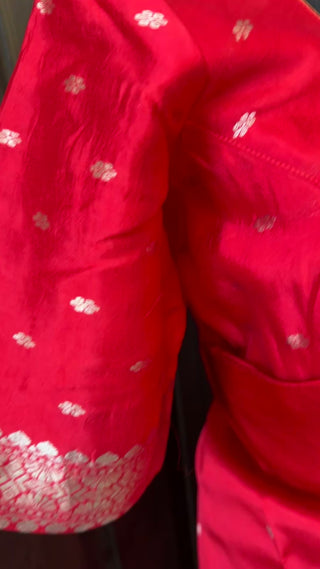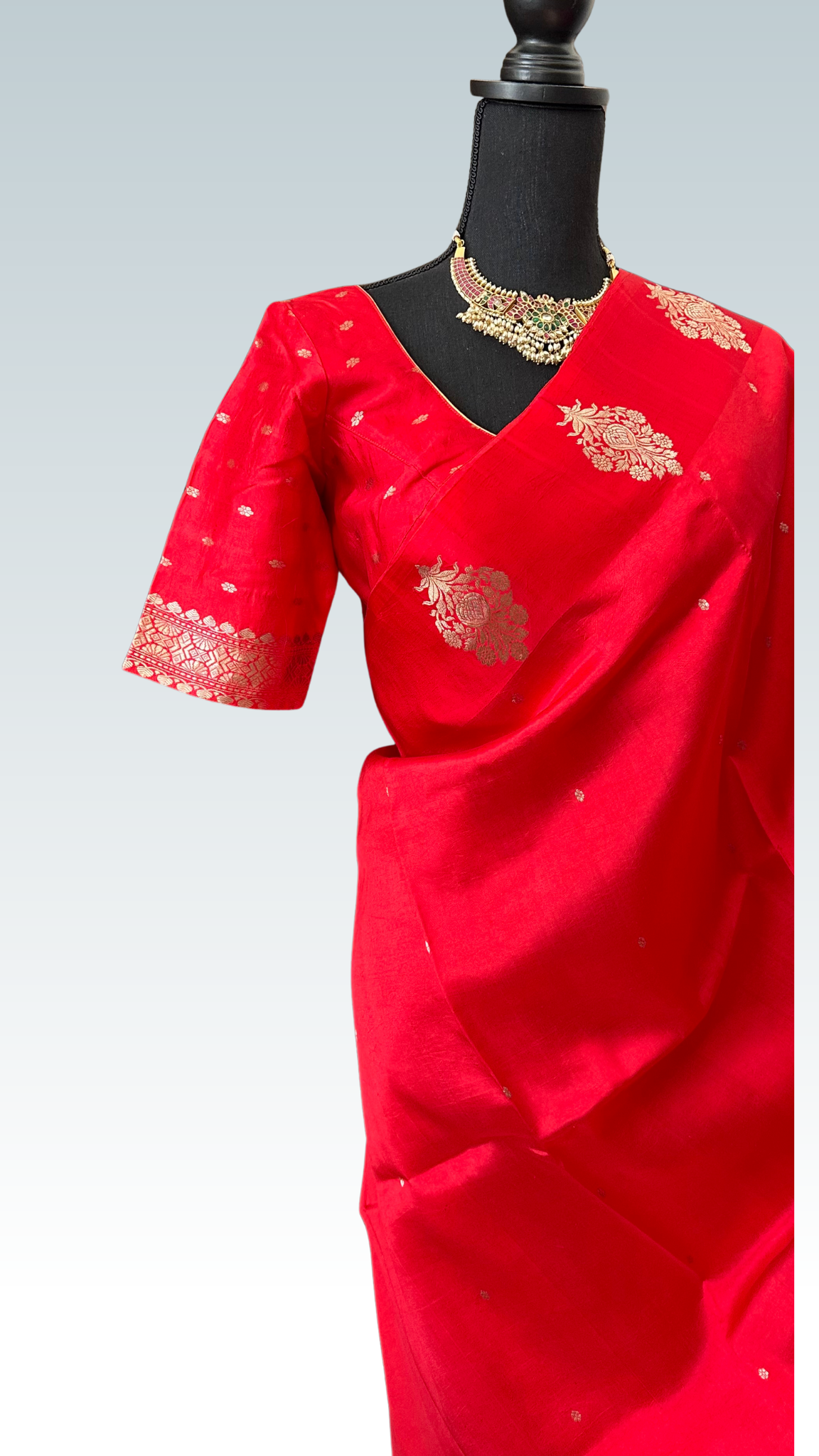 This Banaras Red Pure Silk Saree is a masterpiece of traditional craftsmanship, designed to bring elegance and charm to your ethnic collection. Featuring a soft body with delicate gold, highlighted by a shimmering zari border and an stitched blouse, this saree exudes sophistication and festive grace. Lightweight yet luxurious, it drapes beautifully for weddings, parties, and special occasions. With a pre-stitched blouse option, it combines tradition with modern convenience, making it a must-have for every saree lover.