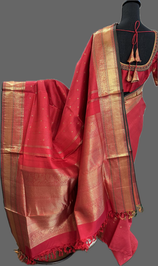Pure kanchi red small checks butta kanjivaram silk saree with prestitched blouse