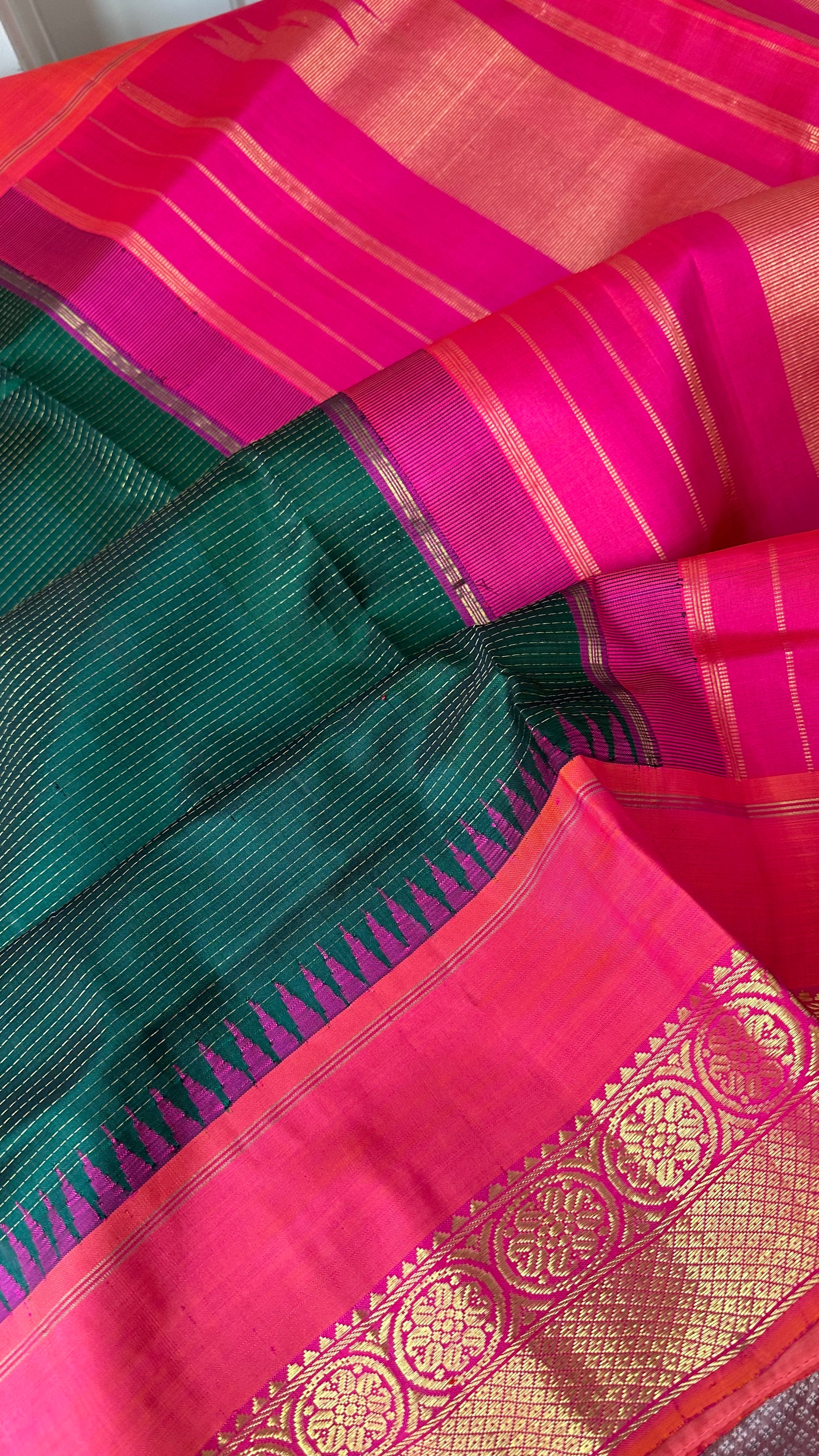 Bottle Green Pink double shade gold checks oosi kanchi pattu saree fine weave kanchi pattu bridal