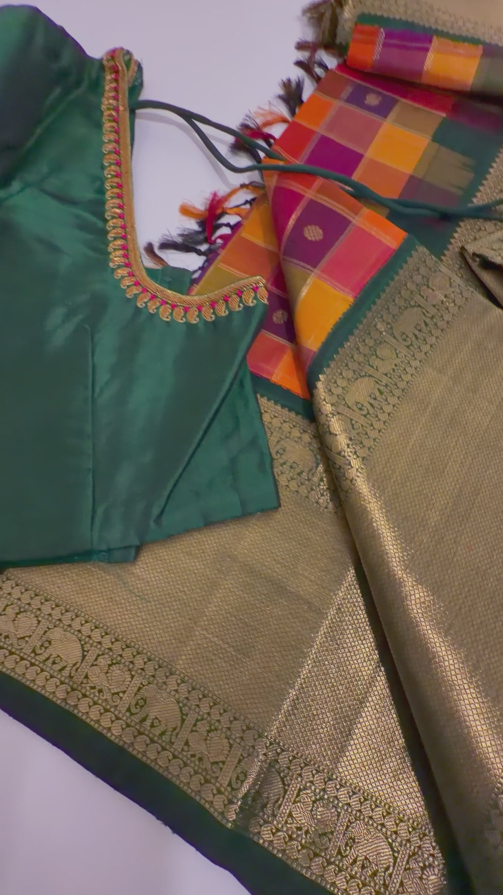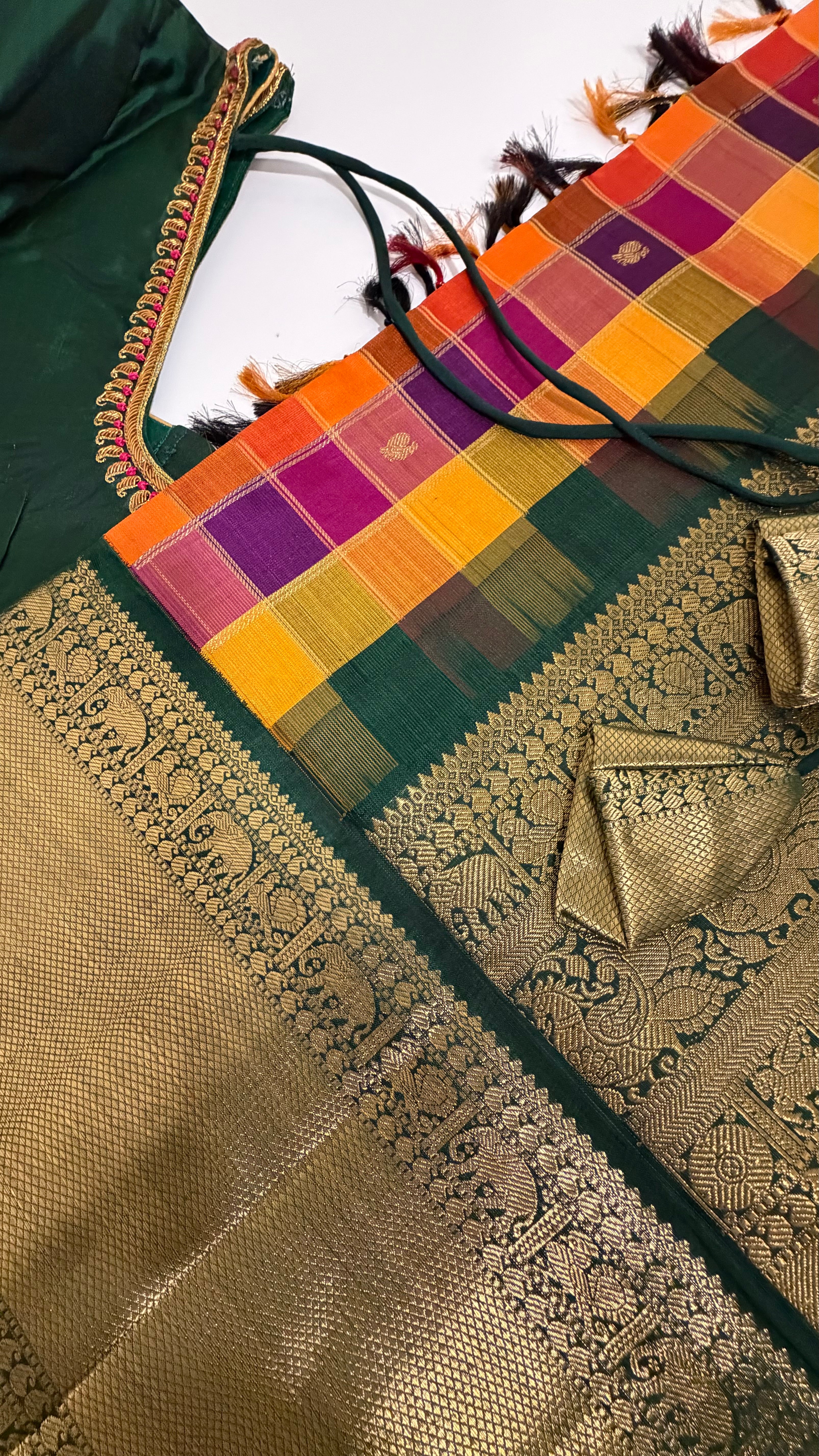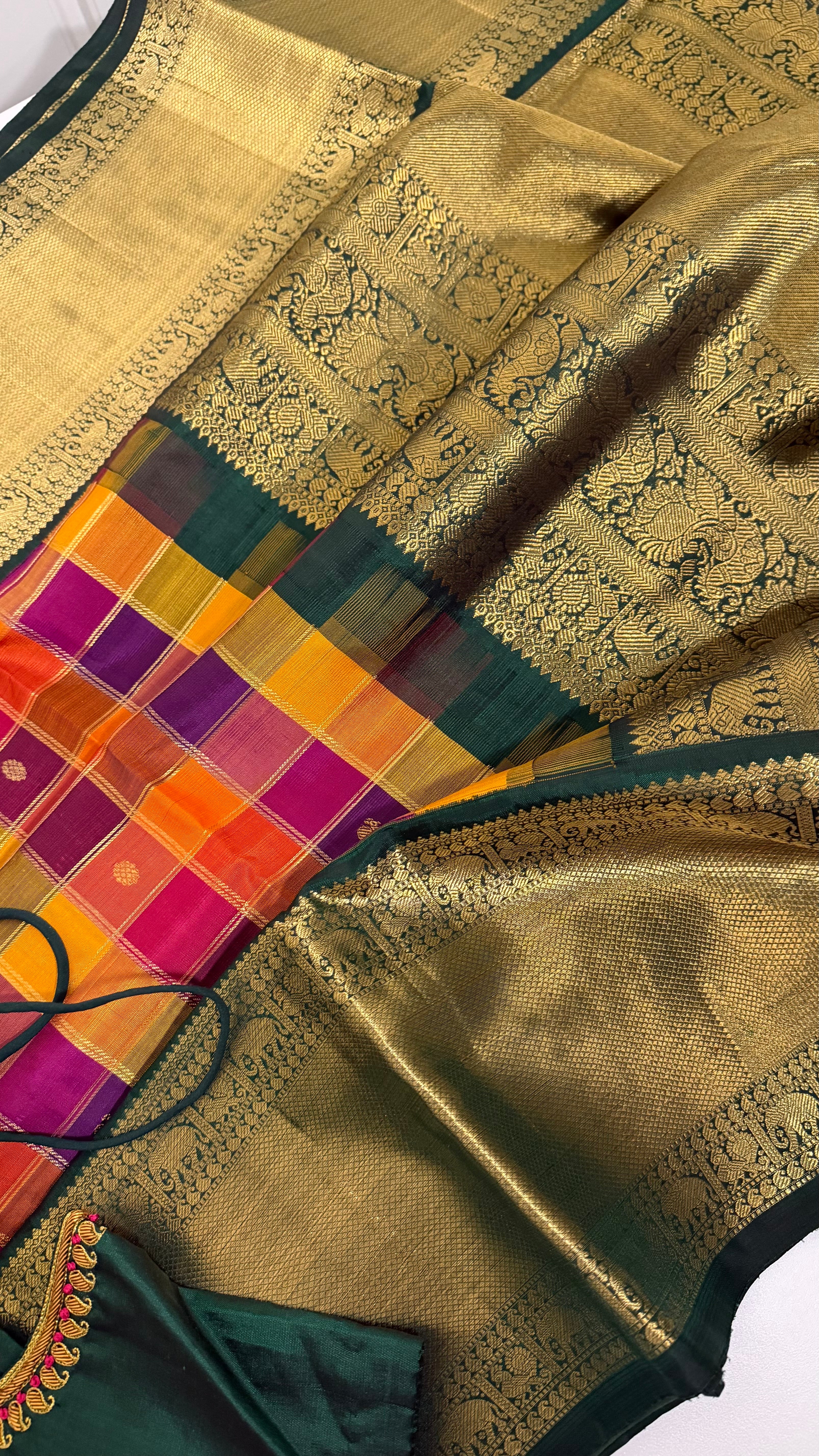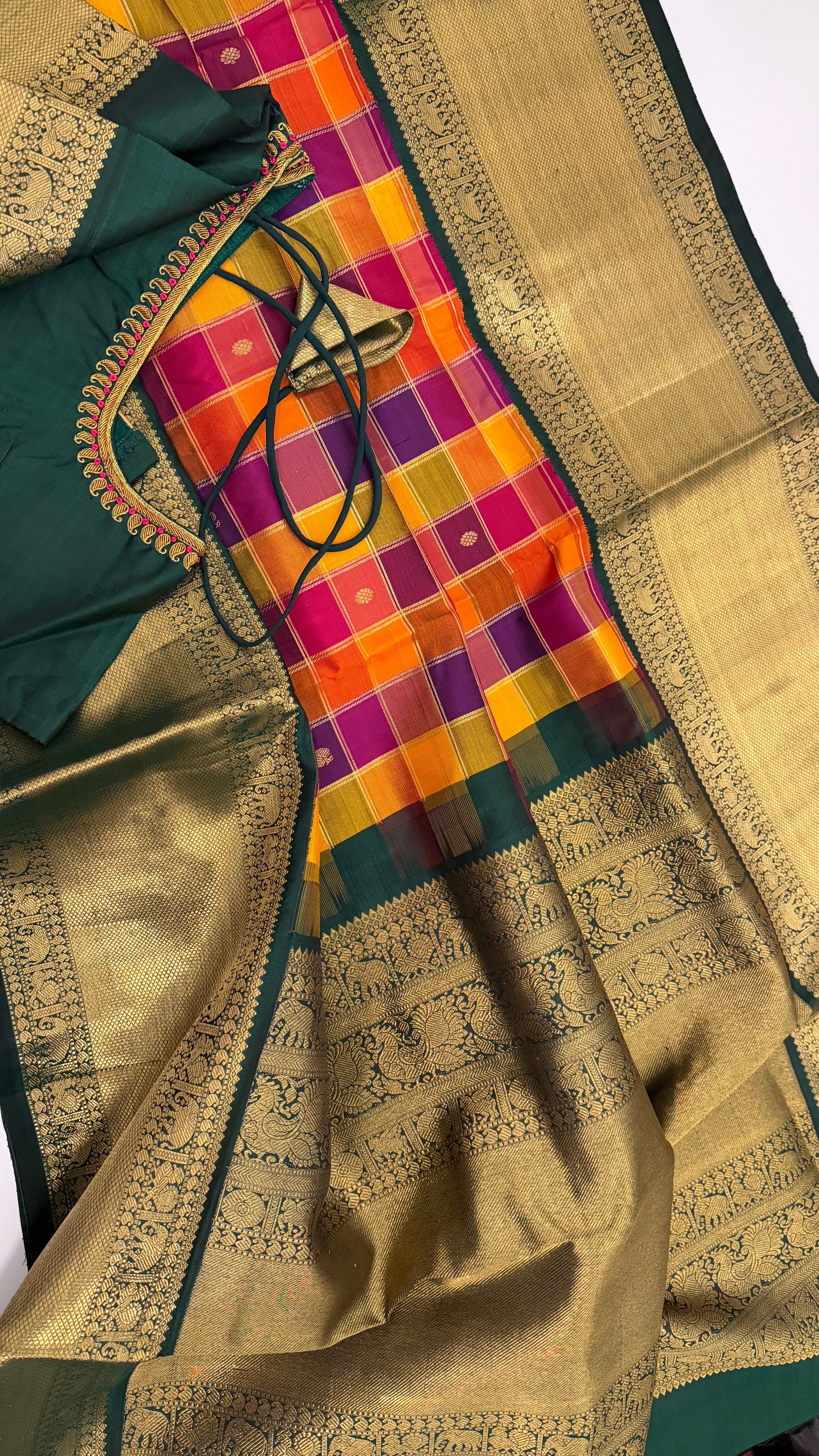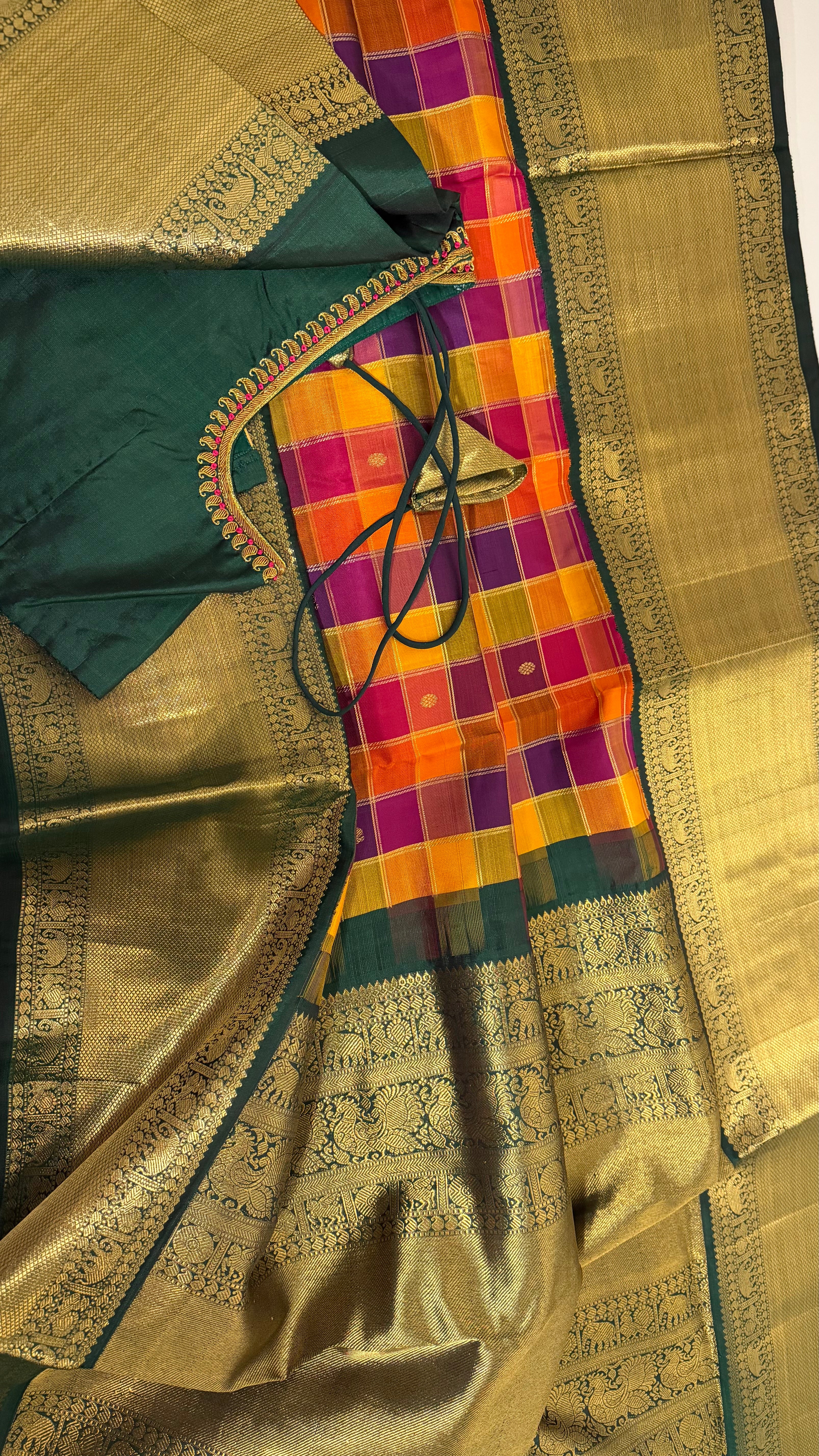 This beautiful check’s  pallum palzhamum saree kanchi pattu saree is handwoven with pure silk and adorned with intricate Pure gold zari lines. It comes with a stitched blouse and ready-to-wear alterations.Blouses comes stitched at 36 and can be altered to fit sizes 42/44. With a range of sizes and video call options, this saree is perfect for brides looking for a traditional and elegant look.