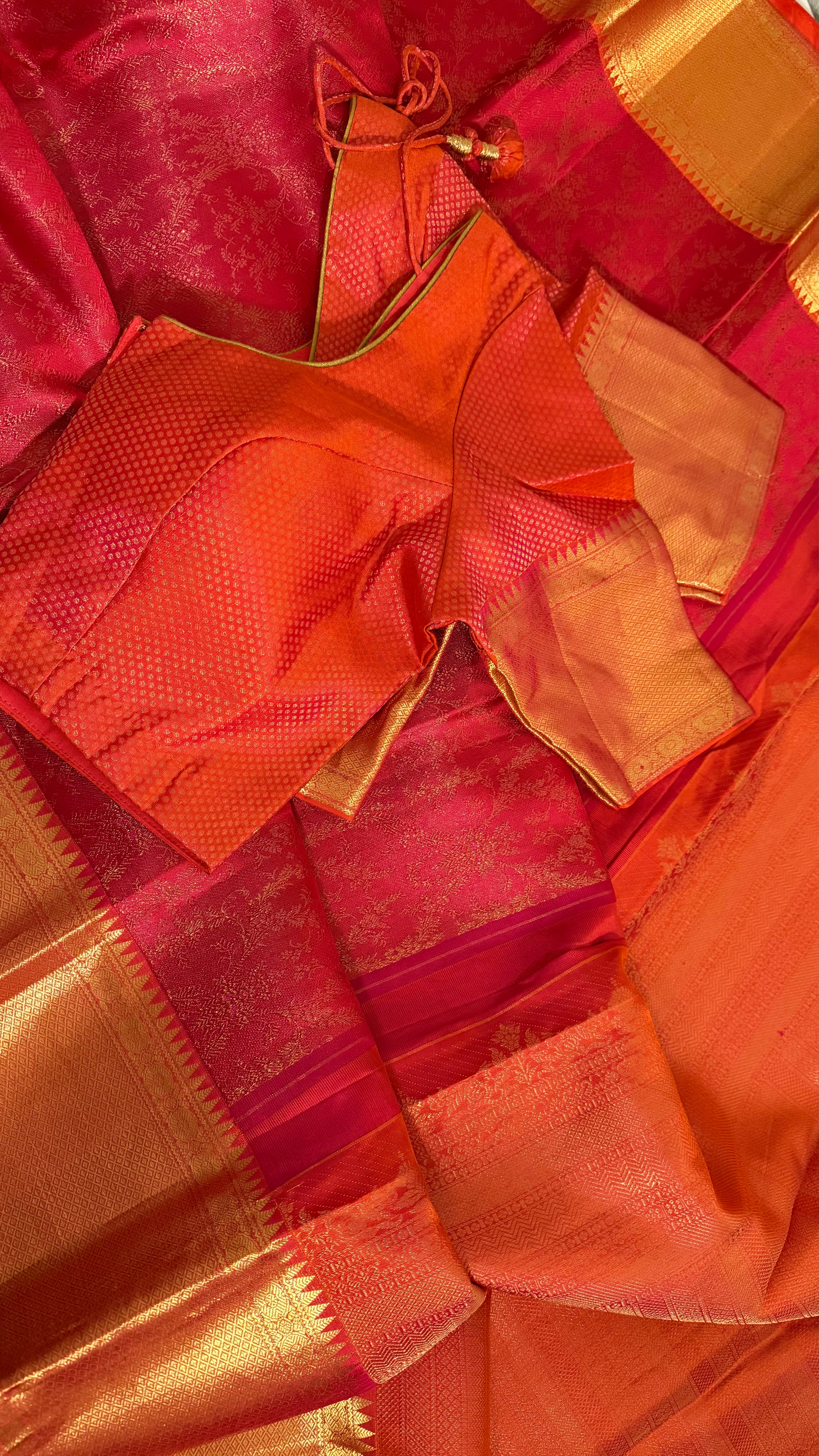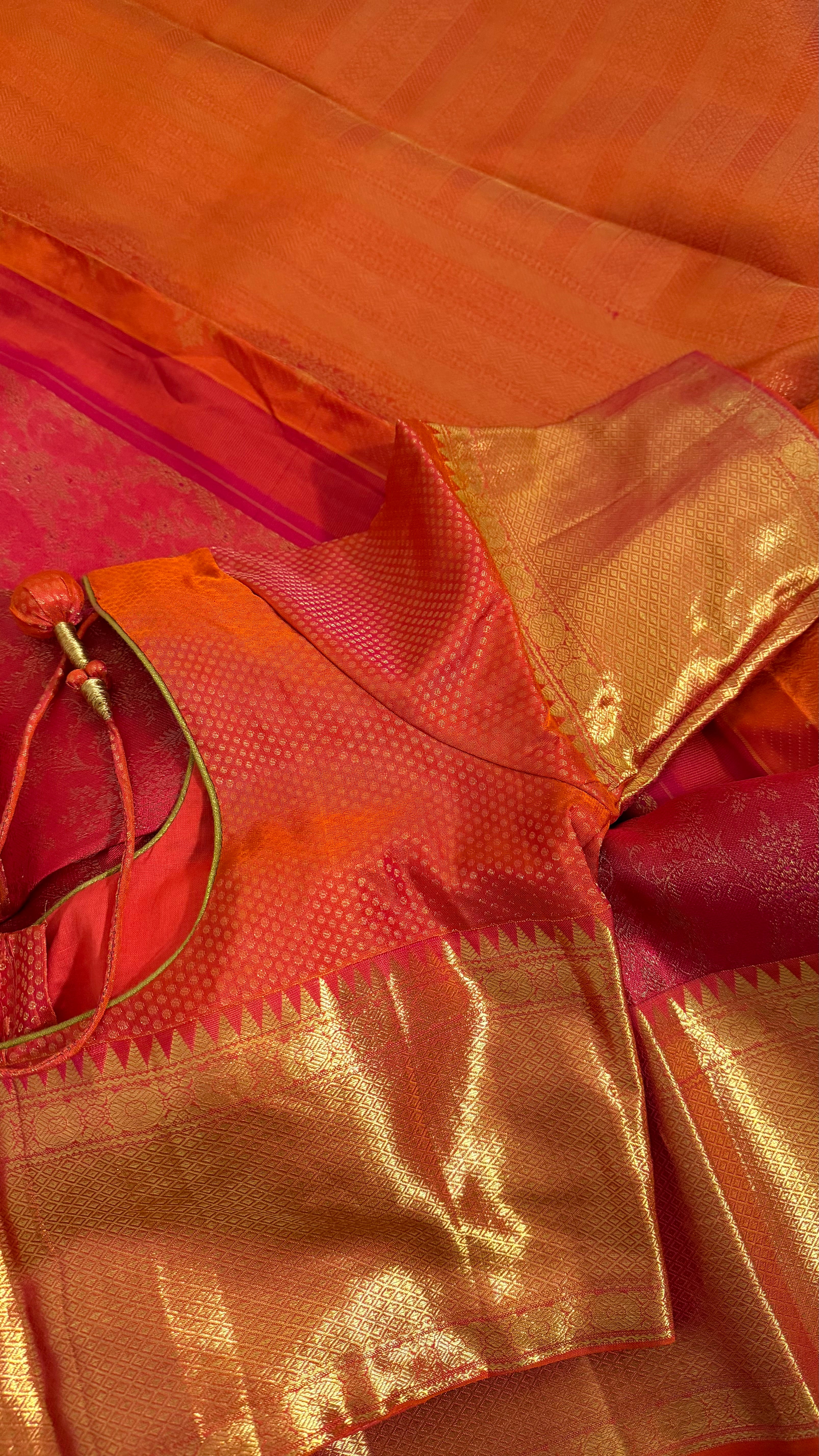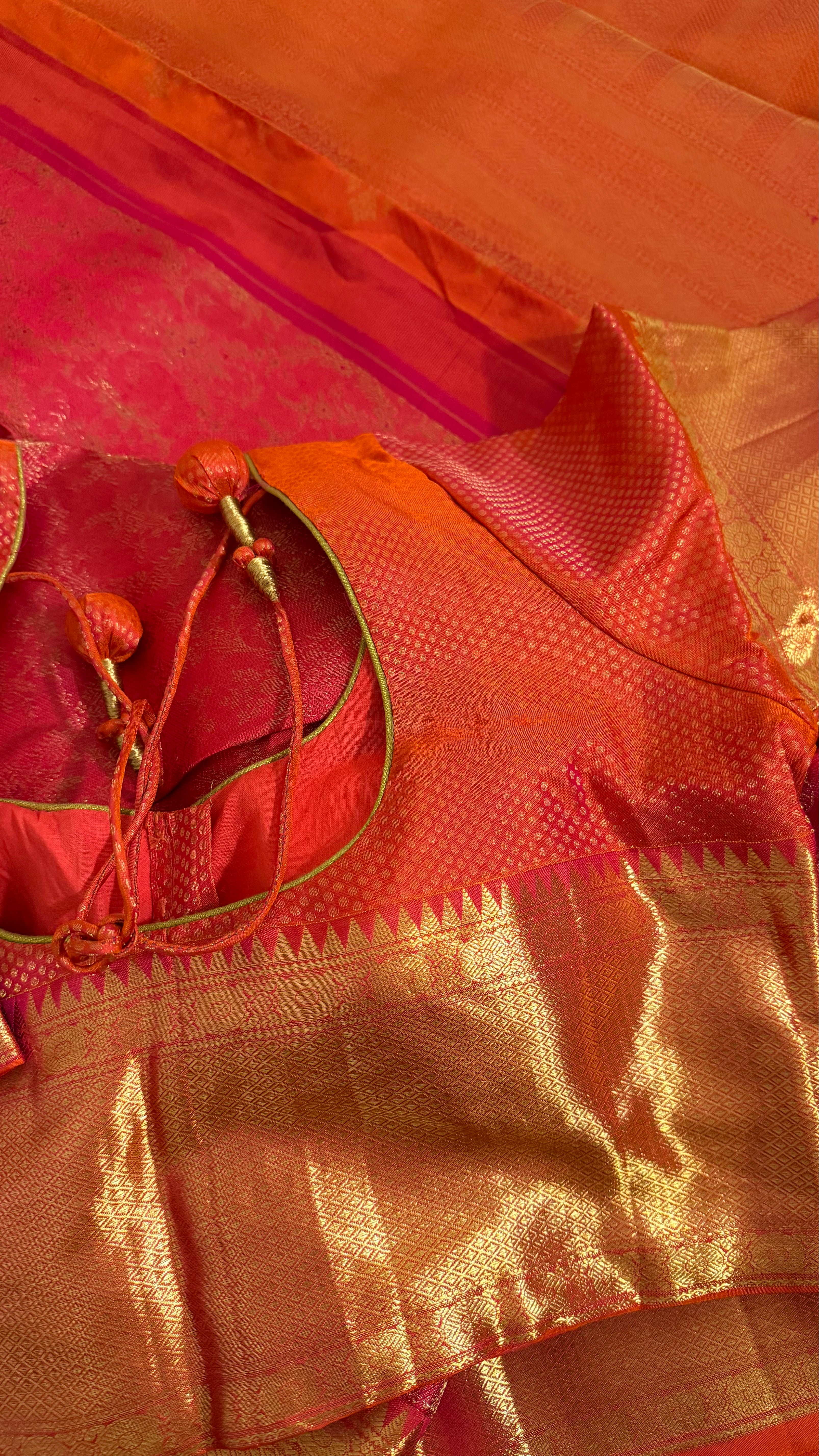 Pure kanjivaram silk Red Orange saree pure zari handloom korvai kanchi redbrocade kanjivaram silk saree with stitched blouse