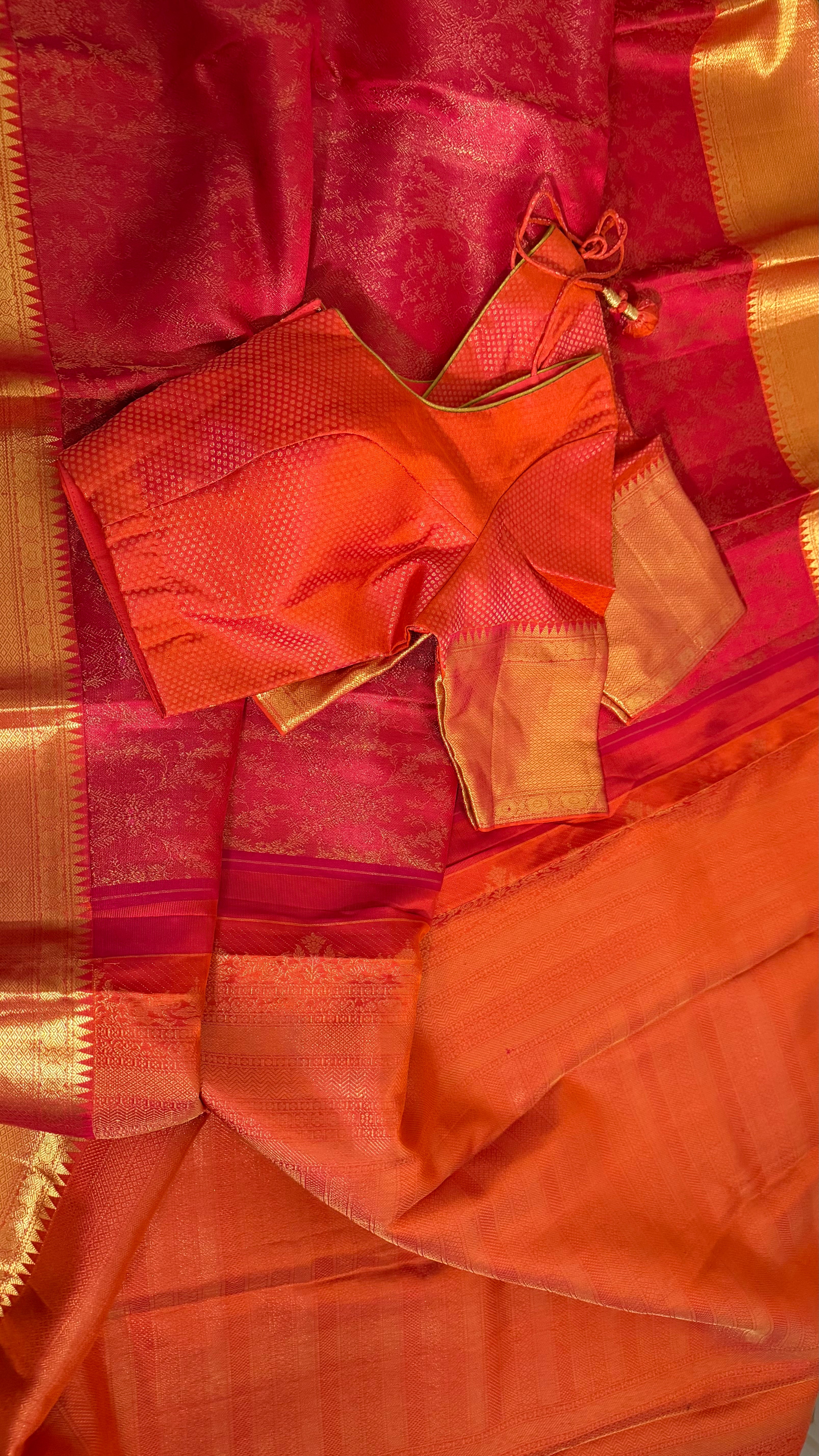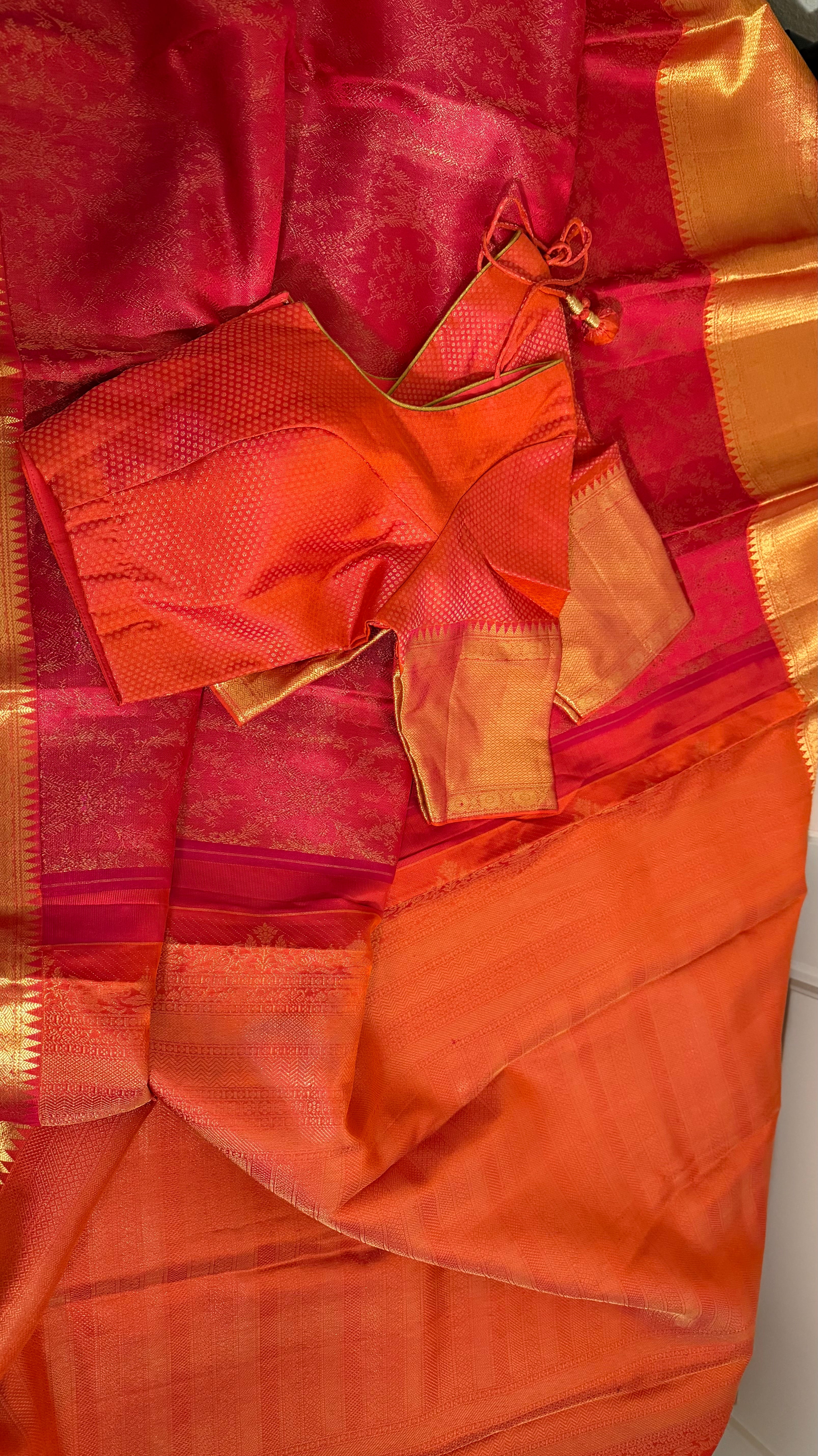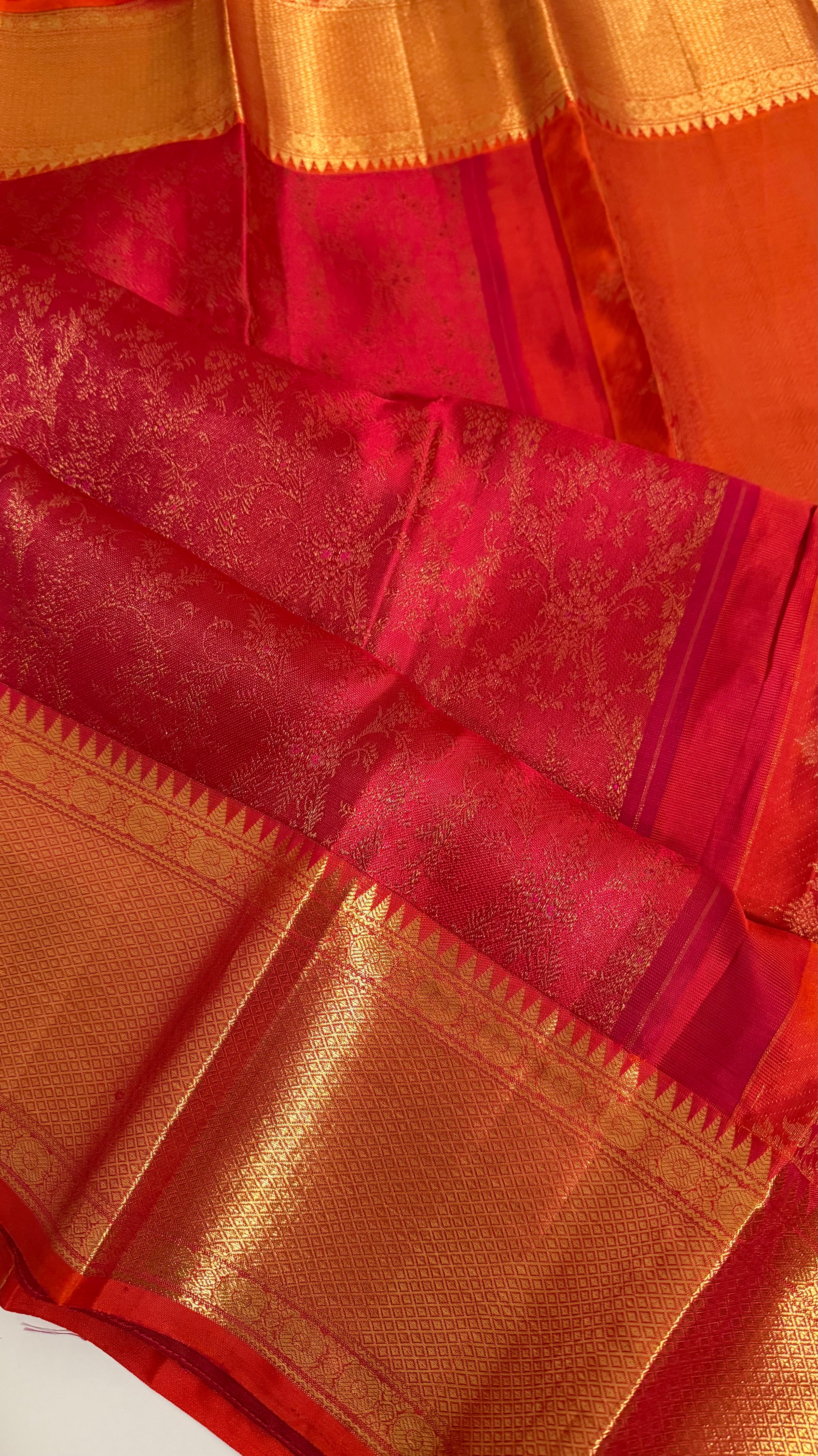 Pure kanjivaram silk Red Orange saree pure zari handloom korvai kanchi redbrocade kanjivaram silk saree with stitched blouse