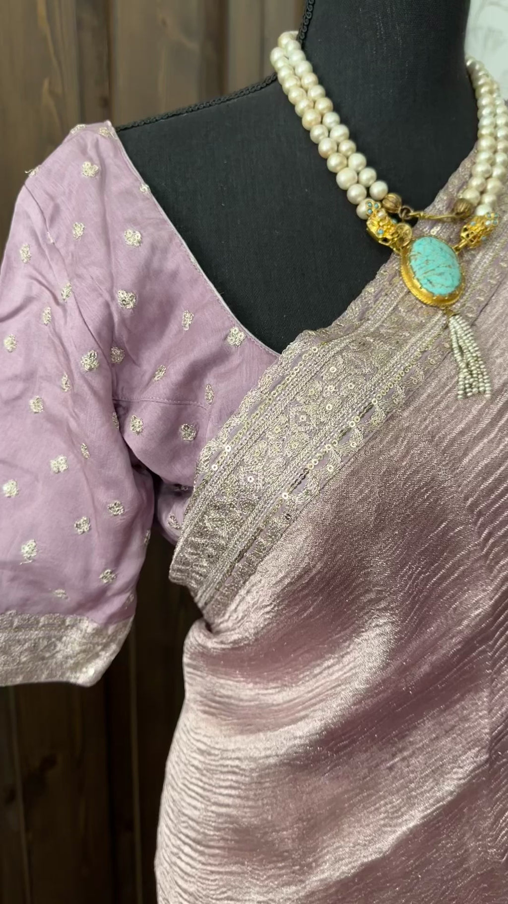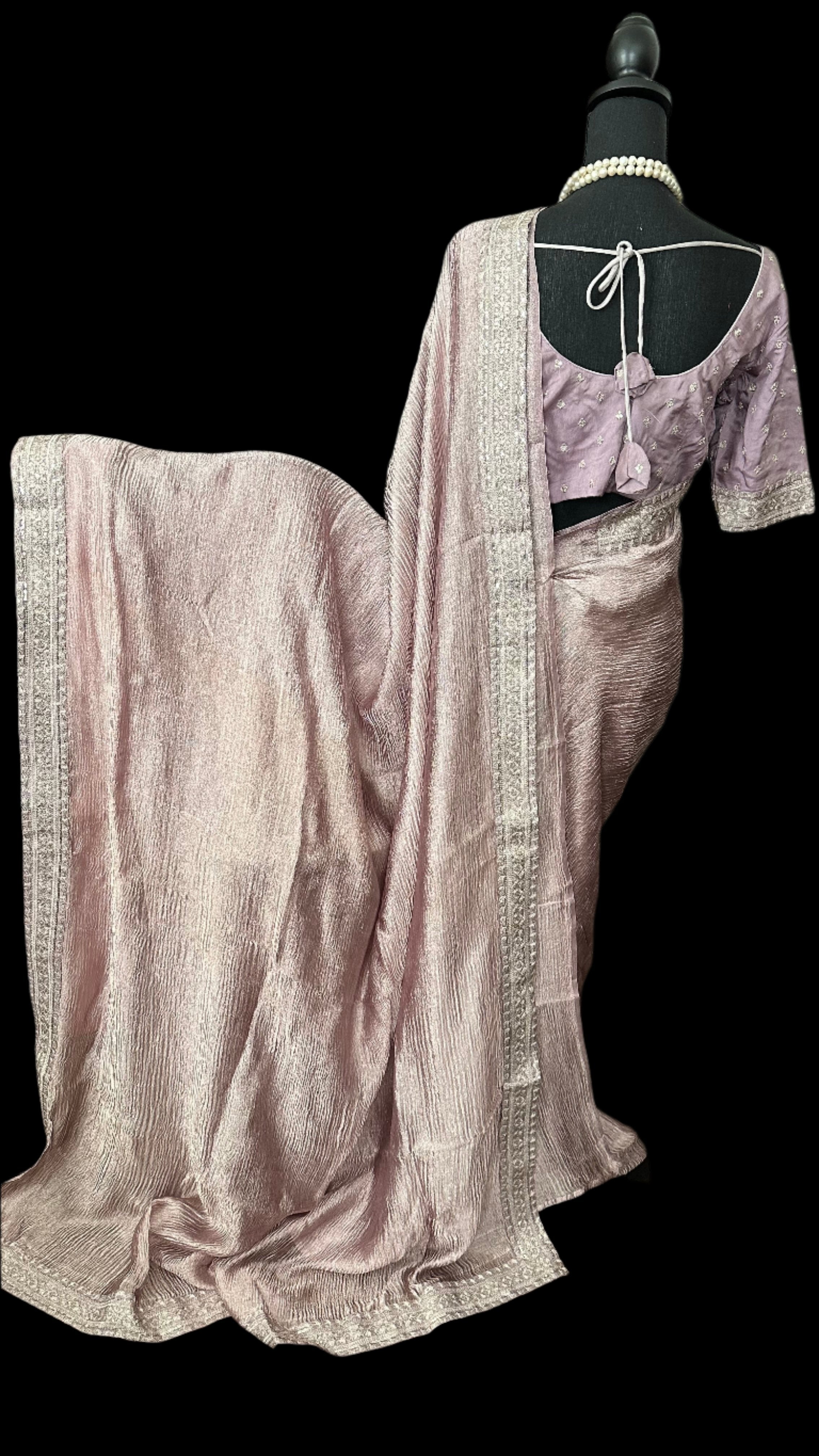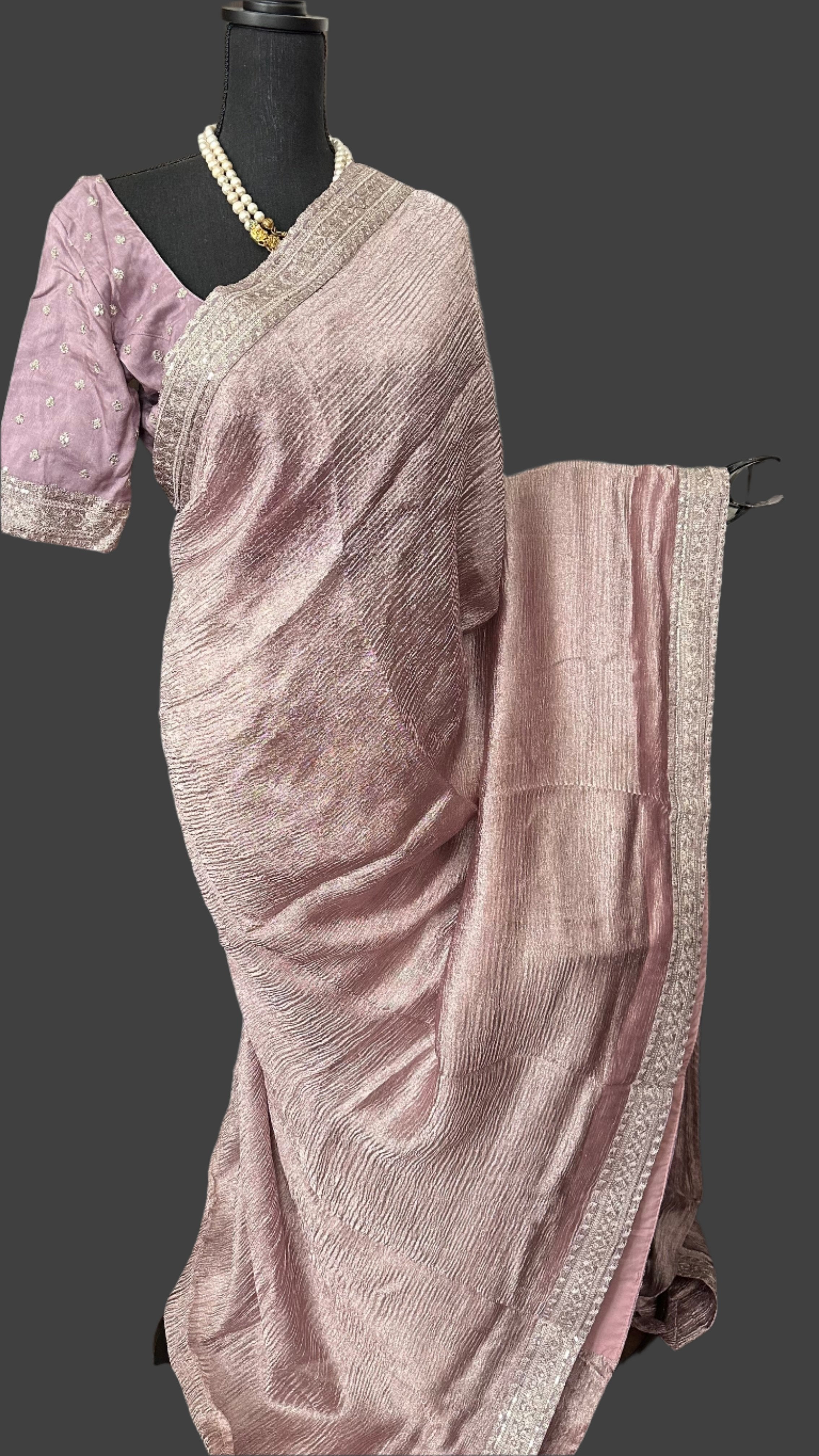 Lavender tissue crushed silk saree with embroidered blouse easy drape online shopping usa