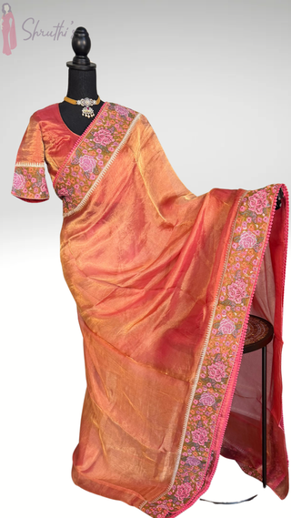 Pure Tissue Organza satin silk borders saree stitched blouse saree readymade online USA