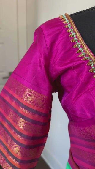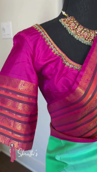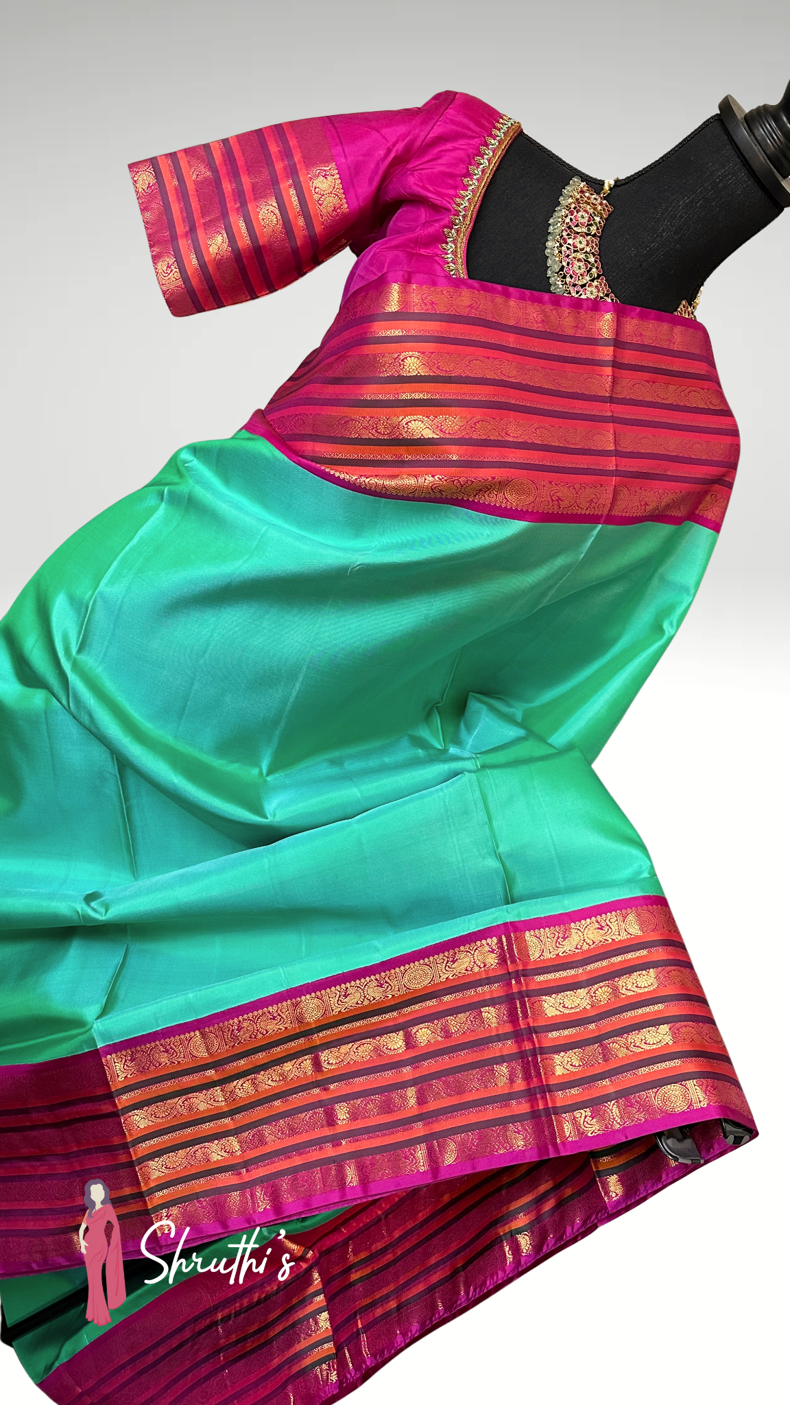 Elevate your bridal ensemble with this exquisite Green Kanjivaram Silk Saree, crafted from premium silk renowned for its rich texture and durability. Featuring intricate embroidery and a ready-to-wear blouse, this saree combines traditional artistry with modern convenience. Perfect for weddings and special occasions, it offers a timeless elegance that enhances your presence with every drape. Available online in the USA, it ensures you can celebrate your heritage with authentic craftsmanship delivered to your doorstep.