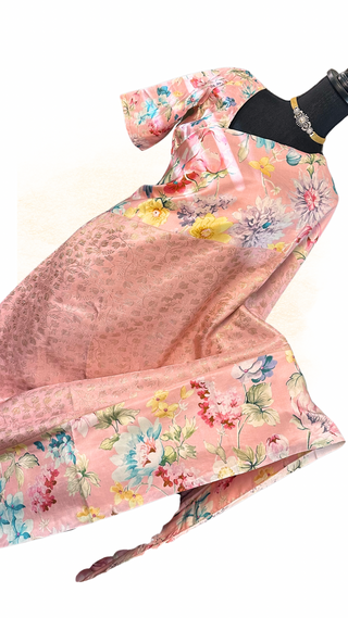 Printed Floral borders Brocade kanjivaram pink gold zari with stitched blouse.