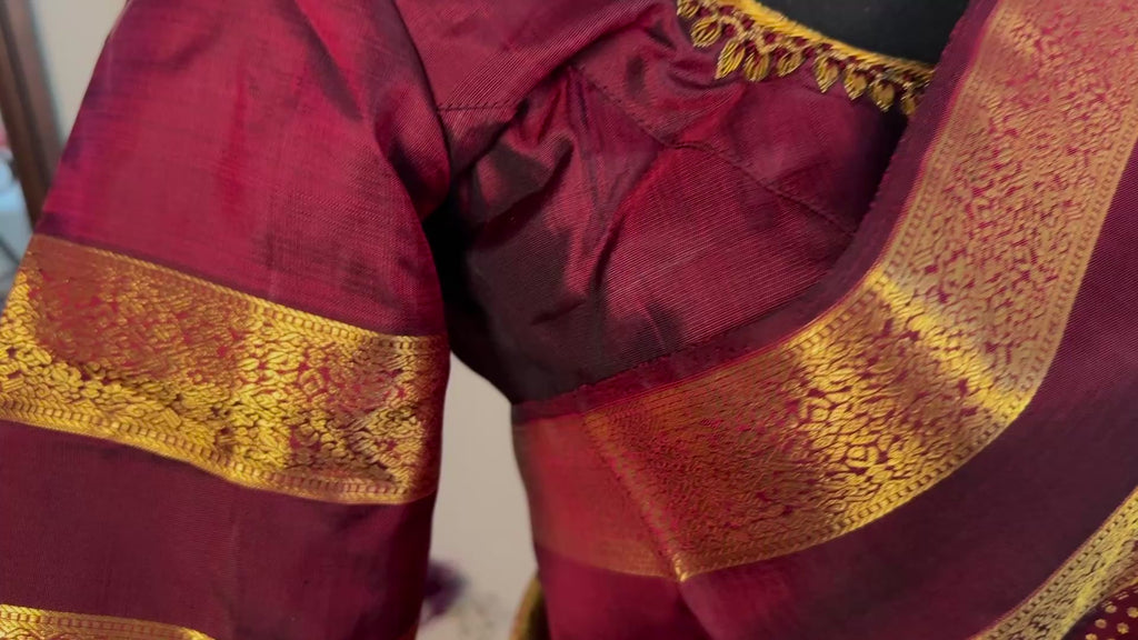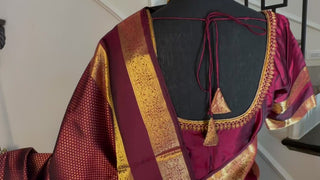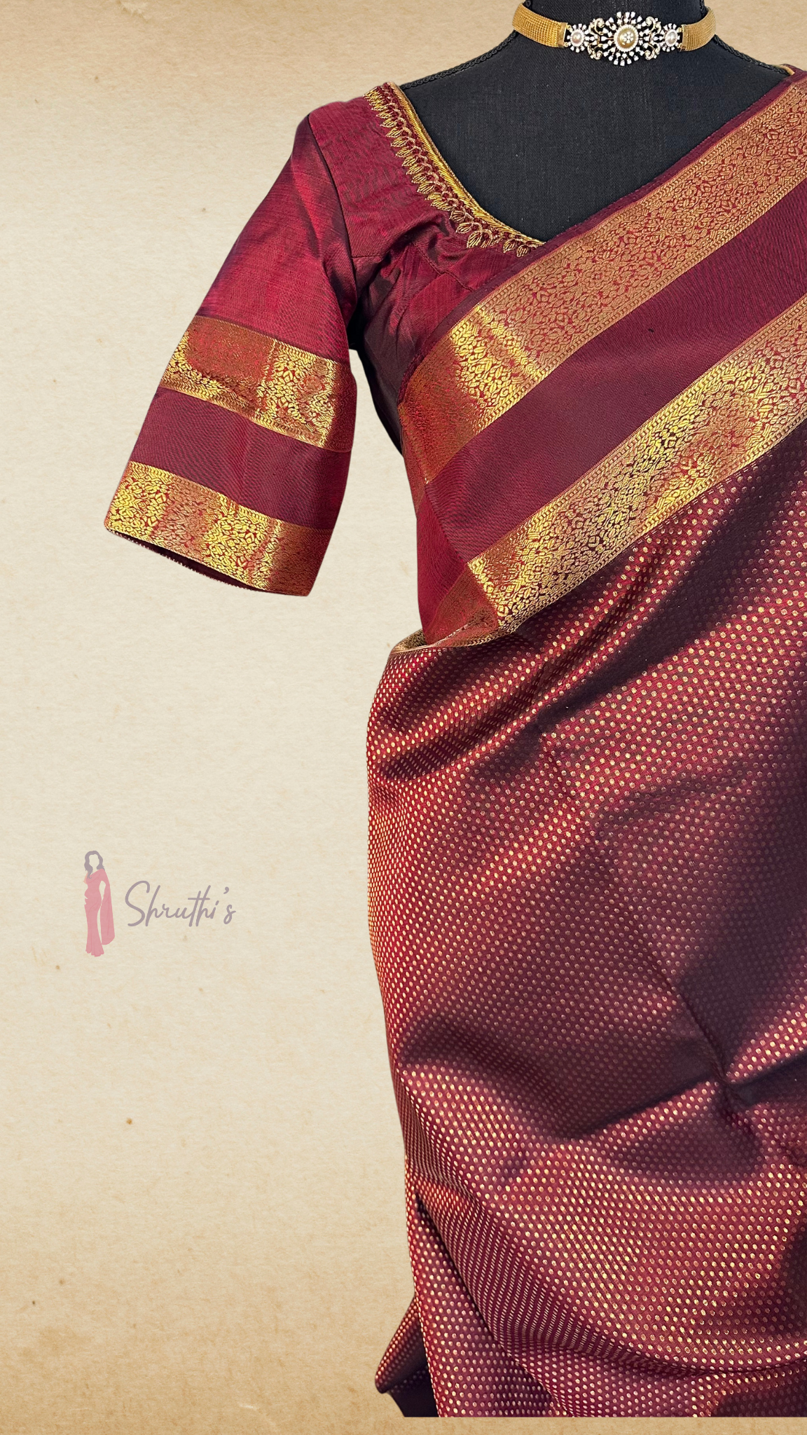 Dark Burgundy KANJIVARAM SAREE with hand embroidered blouse prestitched