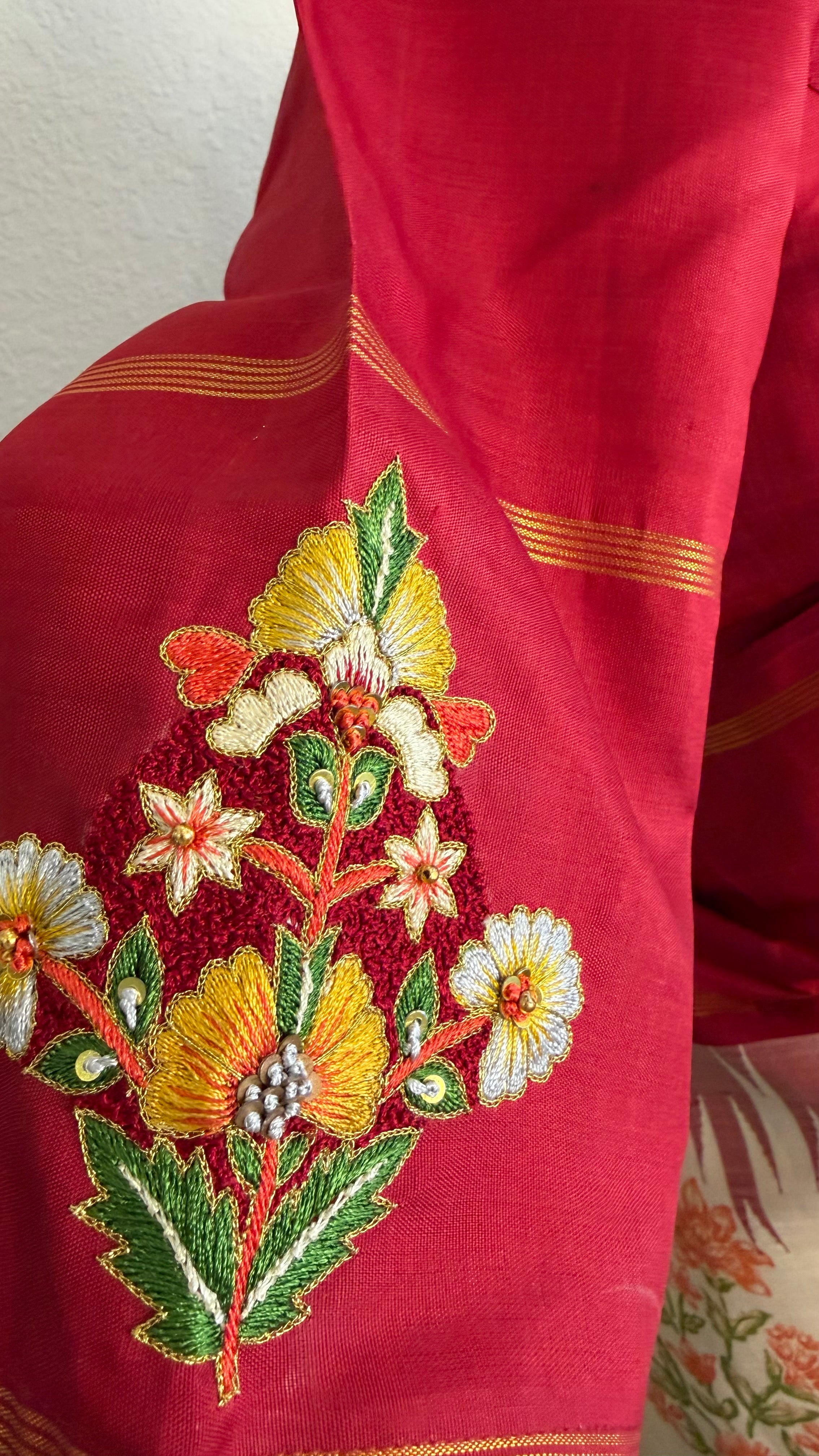 Designer details - Hand block print on the saree with Hand embroidered design on the sleeves and back of the blouse