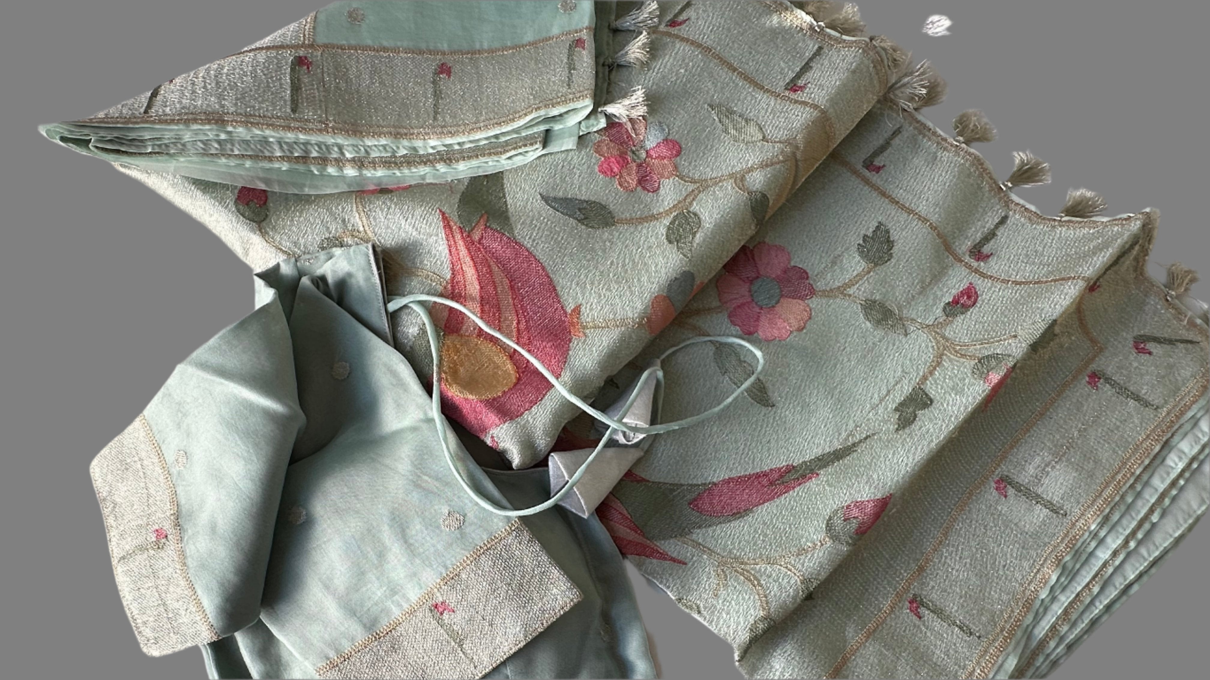 This elegant organza paithani saree features pastel sea green and silver accents, making it a perfect choice for special occasions. The soft weave and stitched blouse allow for easy draping and effortless style. Take advantage of the latest sale and add this beautiful piece to your partywear collection.