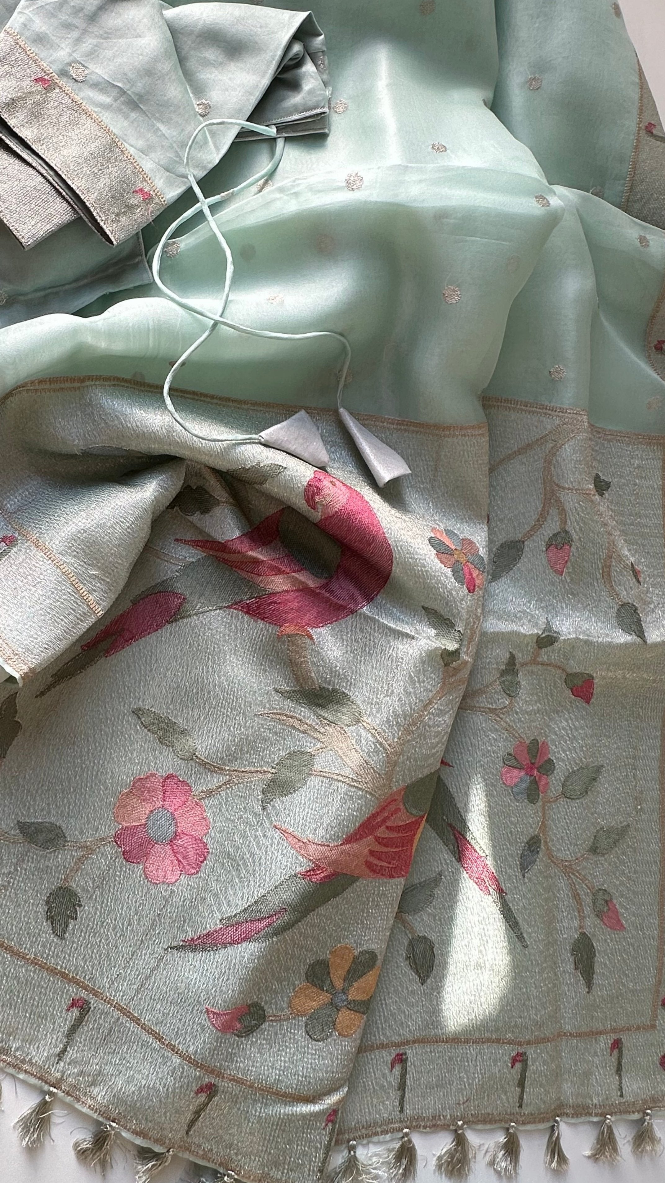Soft organza saree silver zari paithani inspired borders prestitched blouse