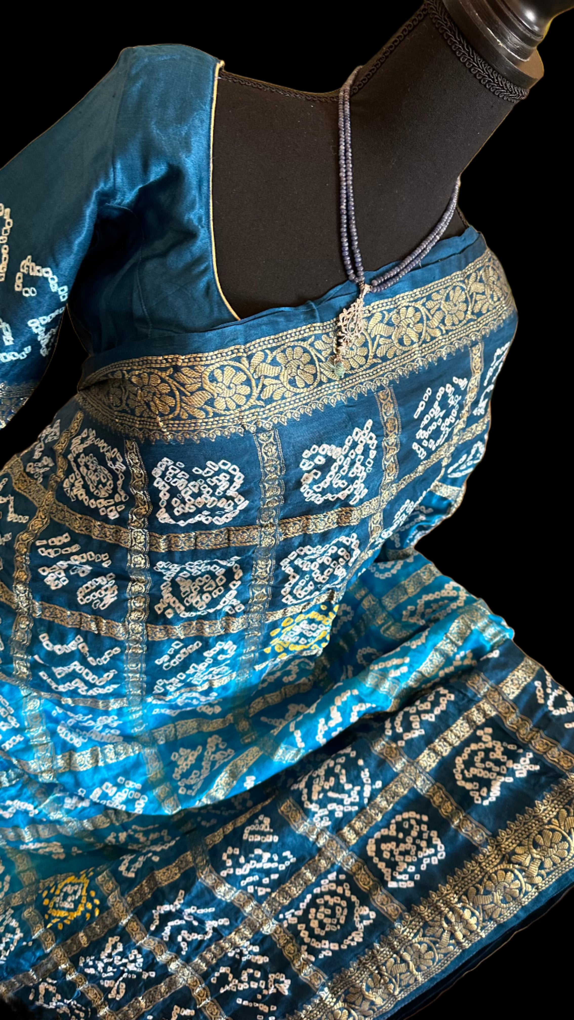 Expertly crafted with traditional hand-done Bandhani technique, this stunning blue bandhani saree is a must-have for your wardrobe. The saree comes with a pre-stitched blouse and pallu, making it perfect for hassle-free online shopping. Elevate your style with this elegant piece, now available in the USA.