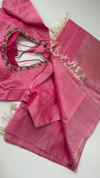 Venkatagiri pure double shade pink silk silver zari with stitched blouse contrast blouse