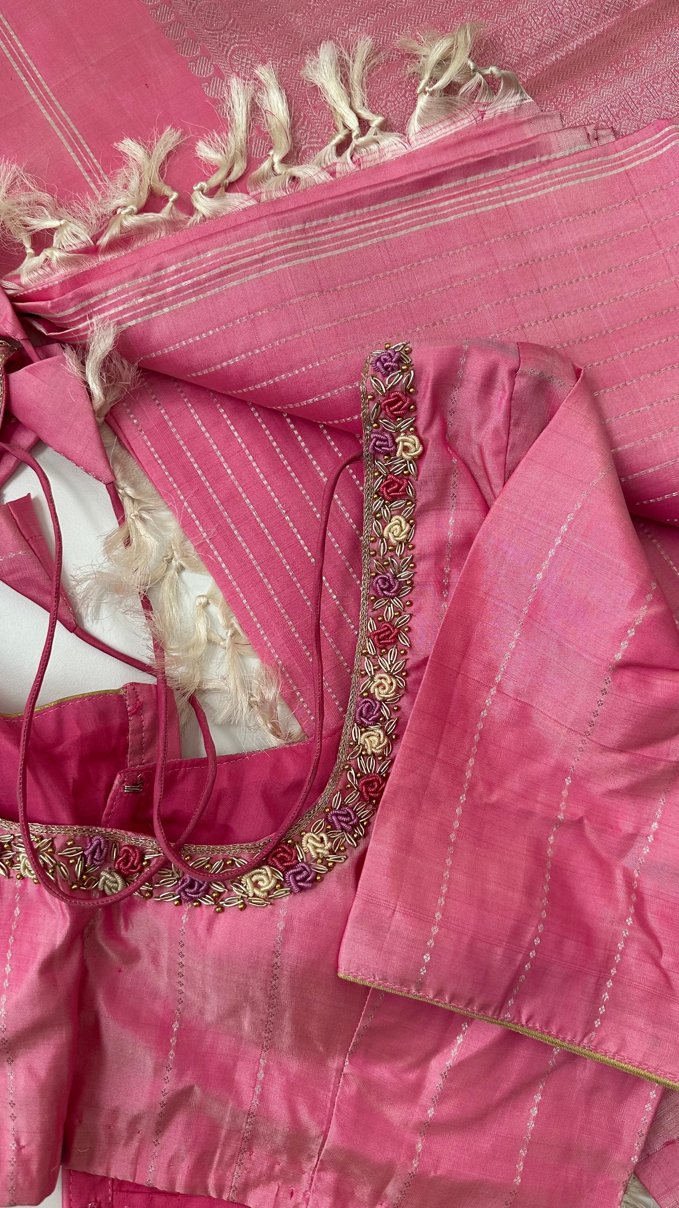Expertly crafted with handwoven beauty, this borderless pastel pink kanchi pattu saree features pure zari for a touch of elegance. The fine weave and easy drape make it a breeze to wear, while the stitched blouse adds a perfect finishing touch. With alterations available and video calls for assistance, this saree is a must-have for any occasion.Borderless kanjivaram pattu saree with silver zari