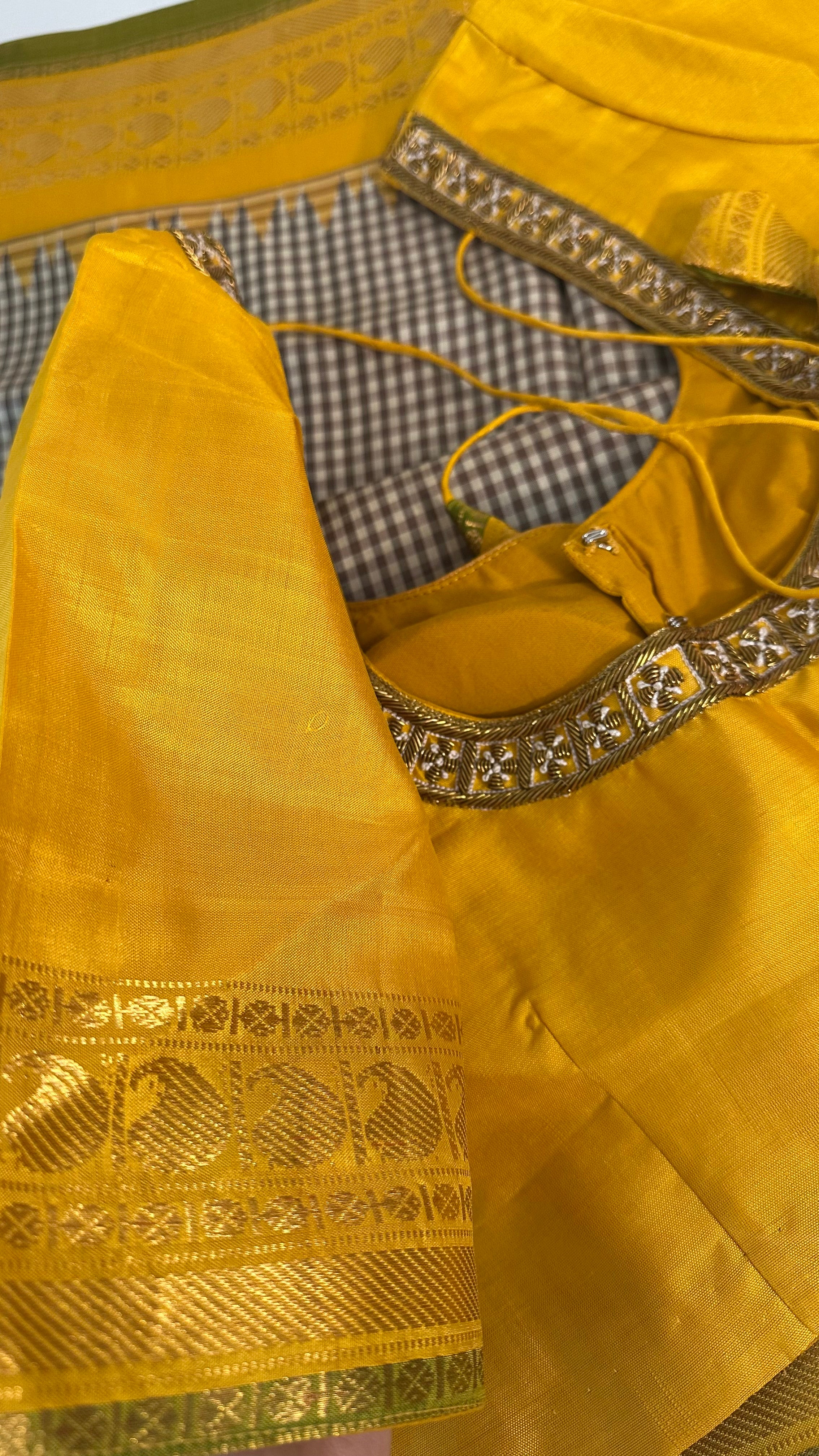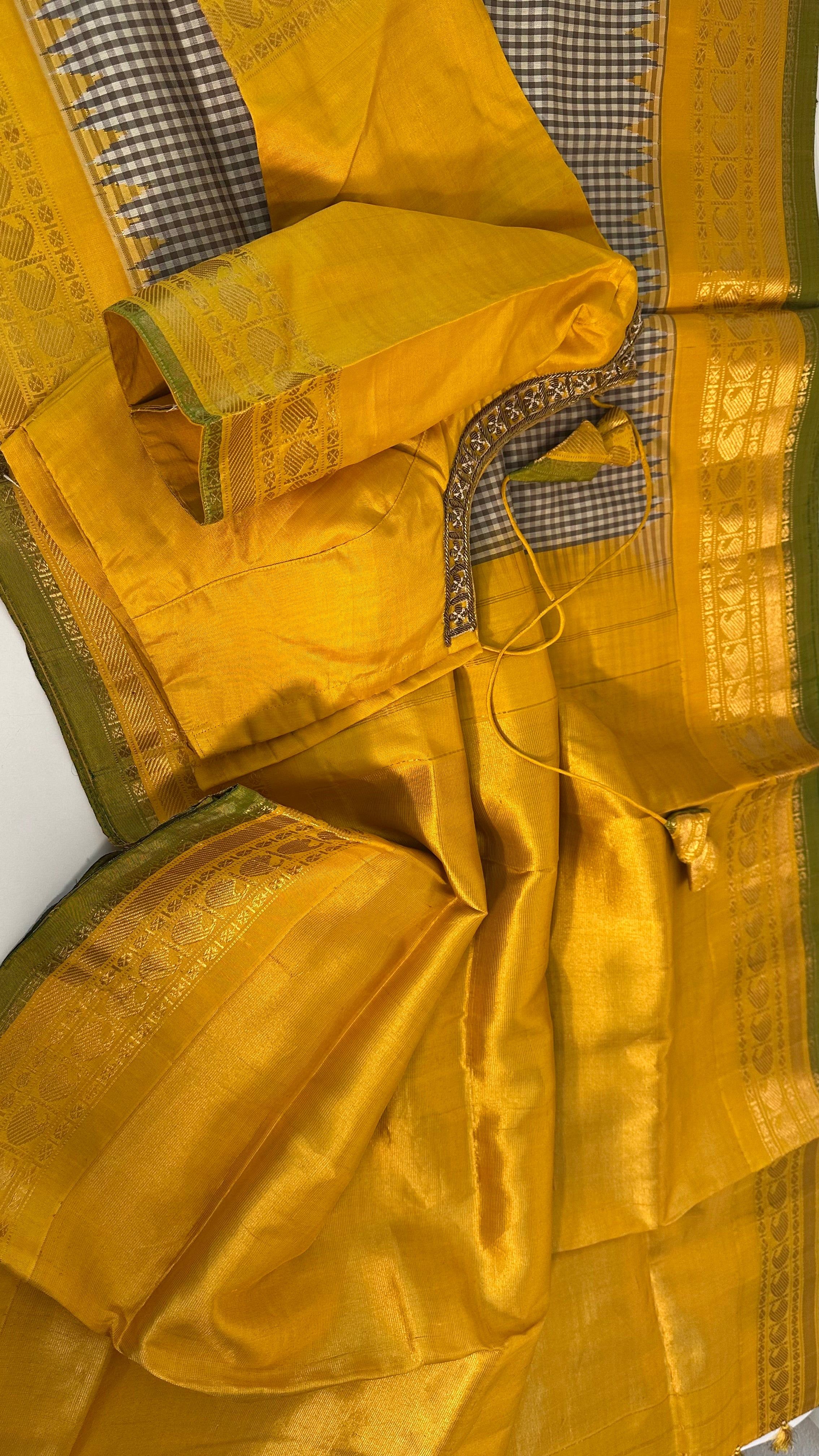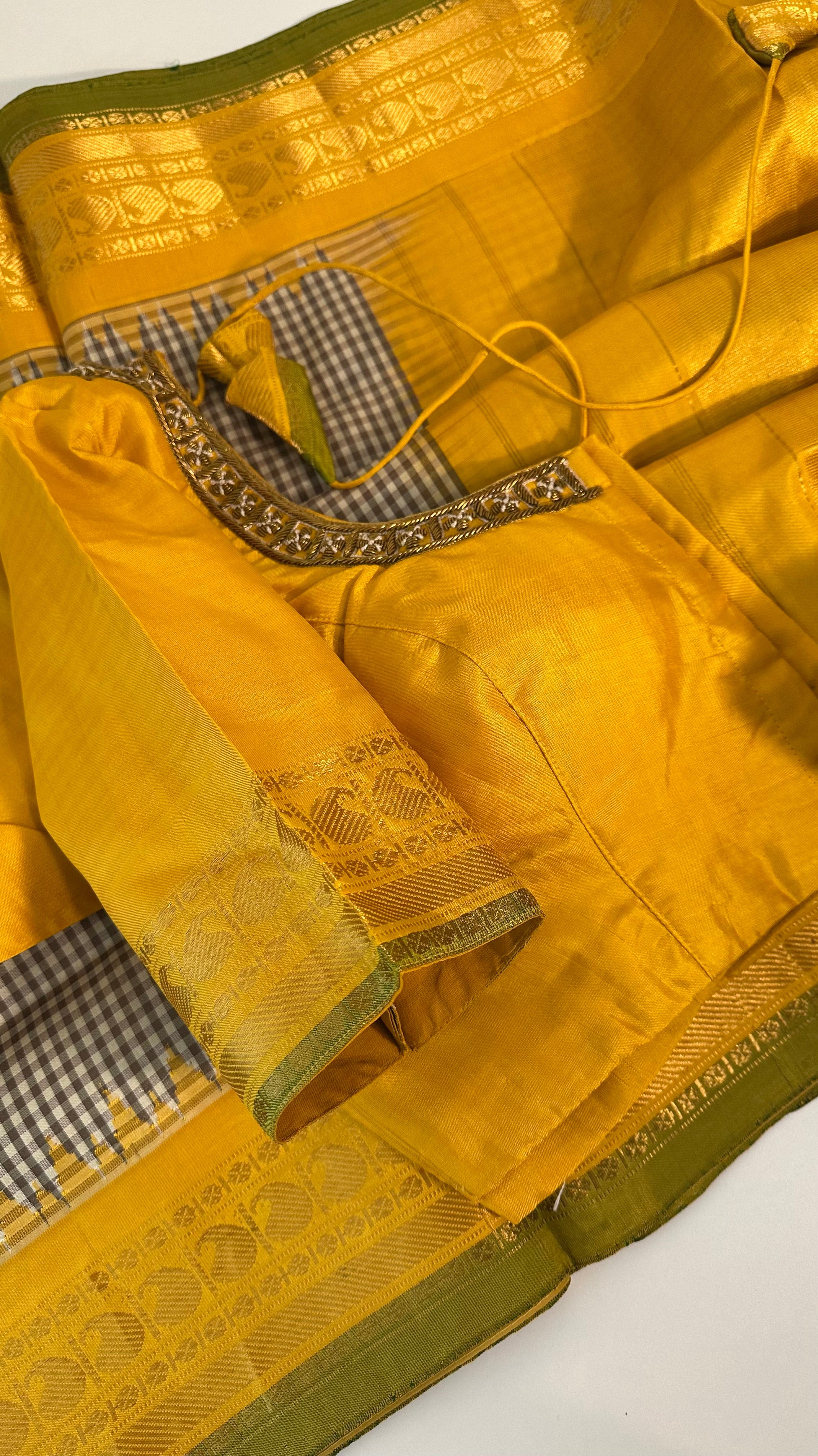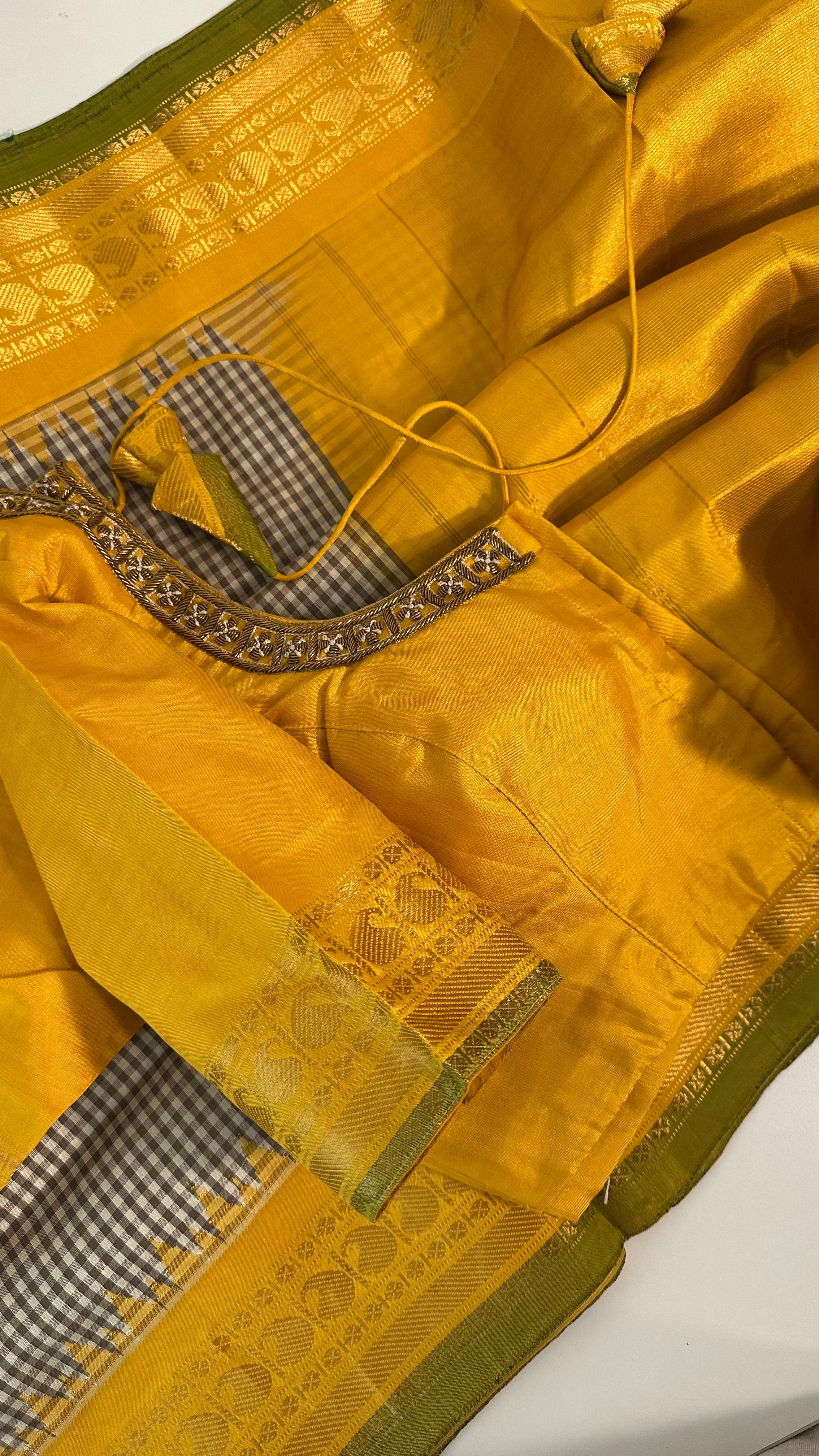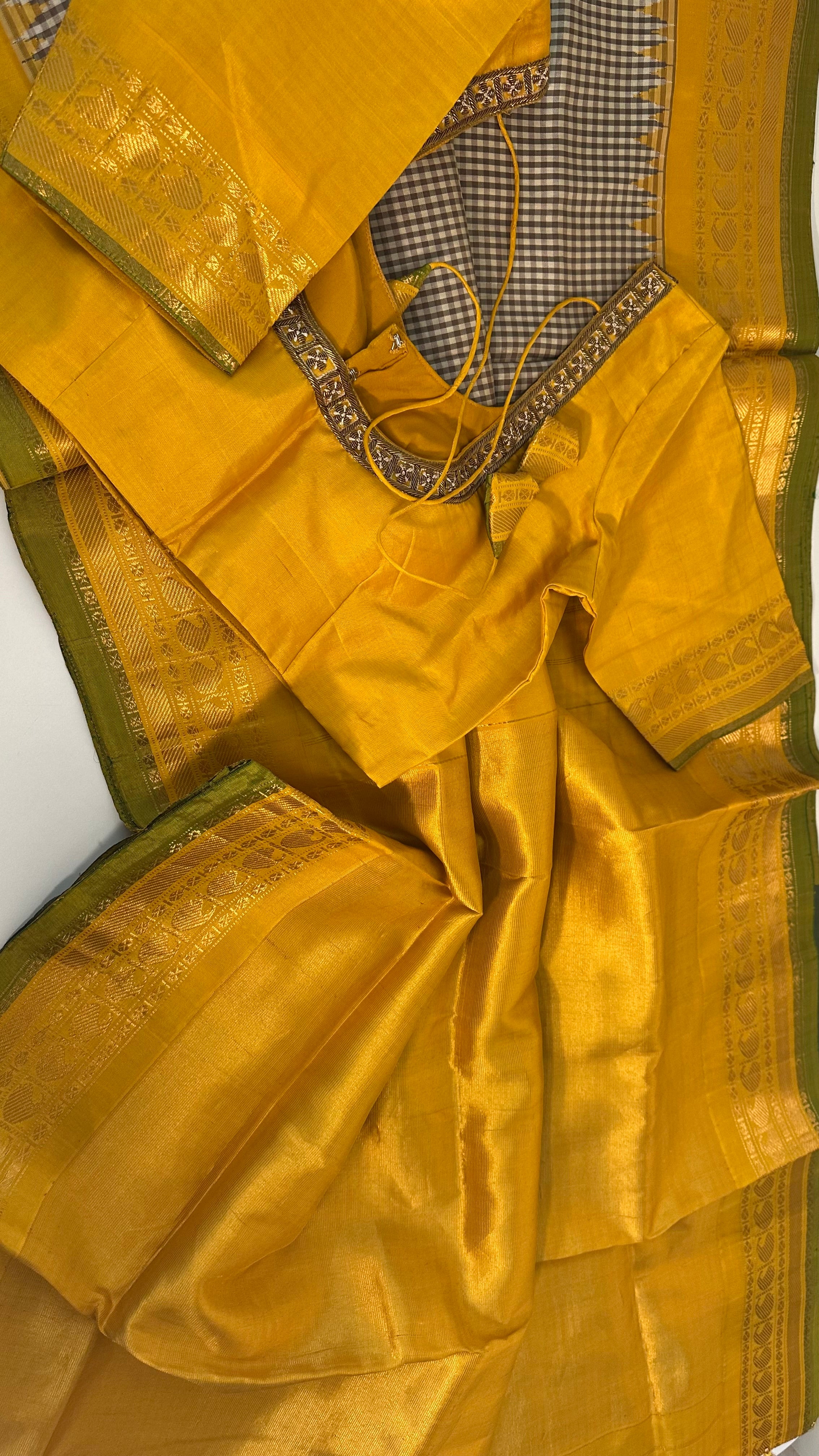 Comes with prestitched blouse size 36 goes up to 42 very beautiful high quality kanjivaram pure silk saree.