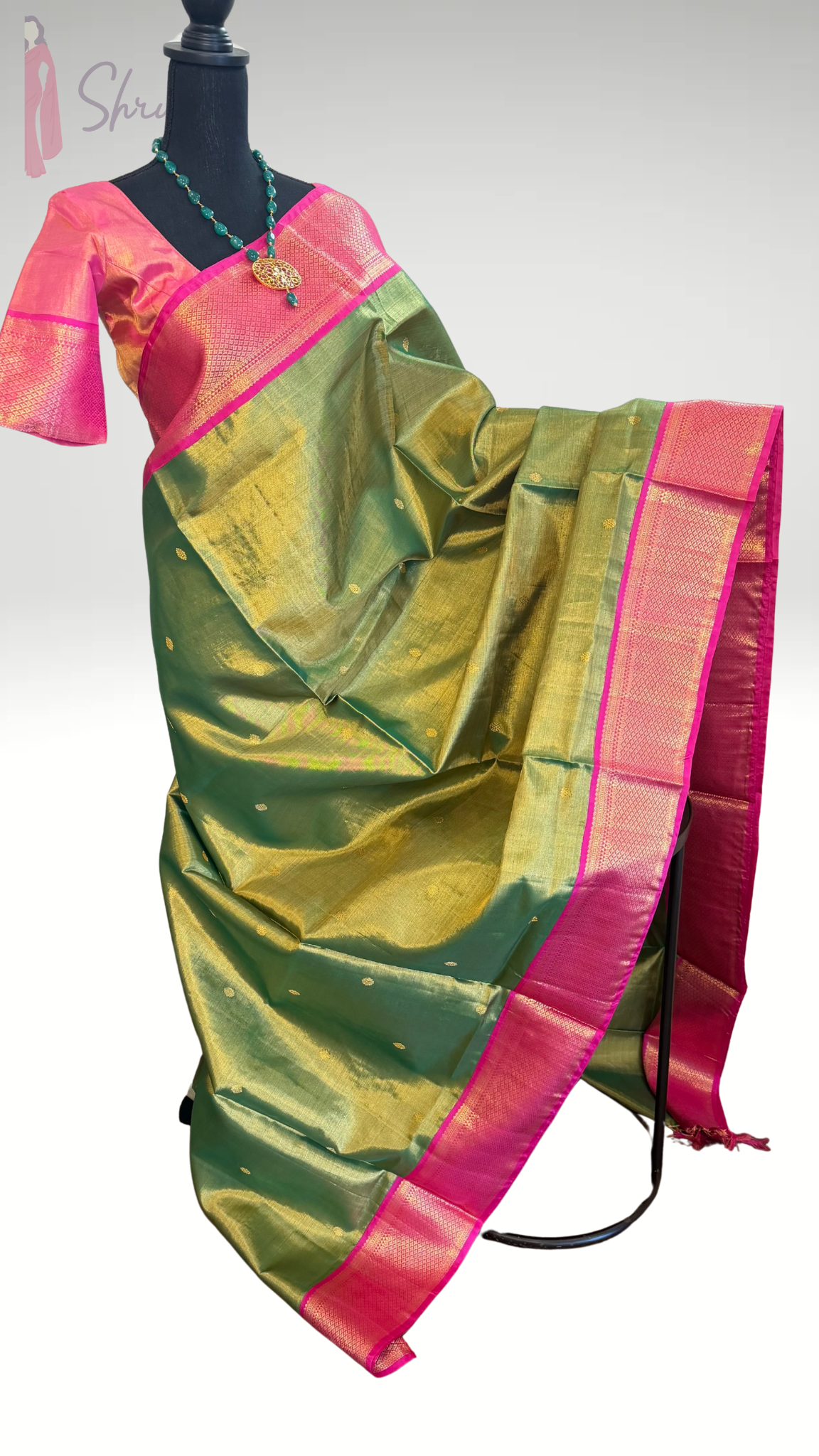 Parrot Green Gold Vairaoosi Tissue kanjivaram silk saree with stitched Indian wedding muhurtam silk bridal blouse online shopping usa