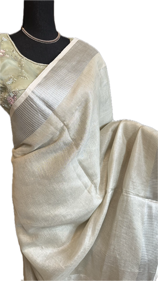 White Linen saree silver zari with stitched blouse online usa sale latest linen lightweight partywear zari borders