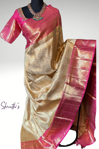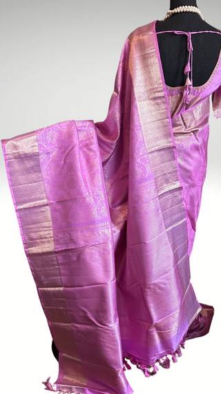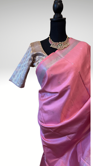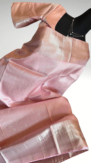 Pastel Pink Pure zari Hndwoven Brocade kanjivaram silver zari with stitched blouse Indian wedding silk saree