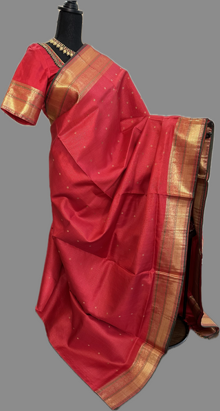 Pure kanchi red small checks butta kanjivaram silk saree with prestitched blouse