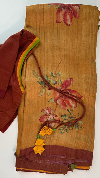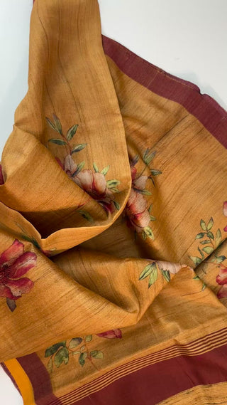 Gold saree tussar Partywear hand painted silk saree online gold zari borders with blouse
