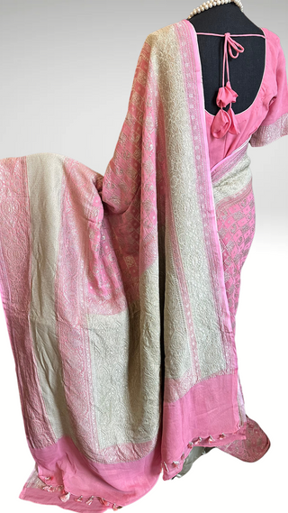 Pastel Pink pure silver zari soft silk saree zari and hand embroidered blouse