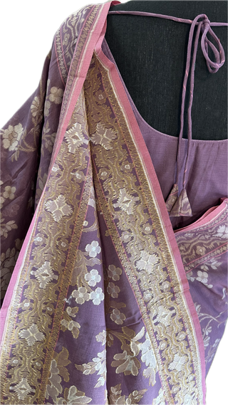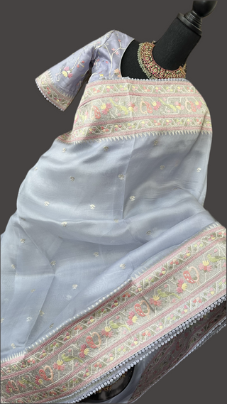 Pastel lavender silver tissue Organza soft weave paithani silver borders with stitched blouse