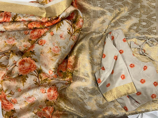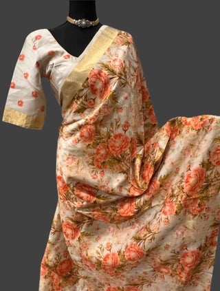 Cream Beige Printed soft silk double ply saree online with Hand embroidered prestitched blouse