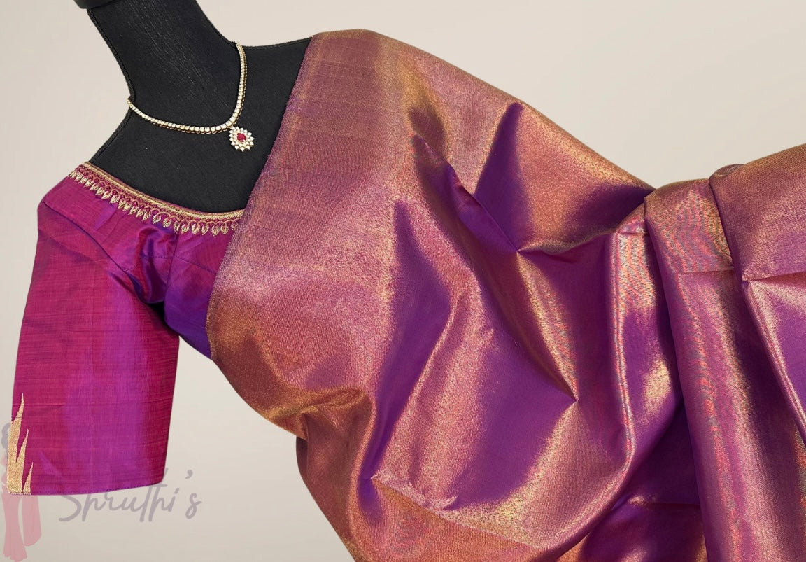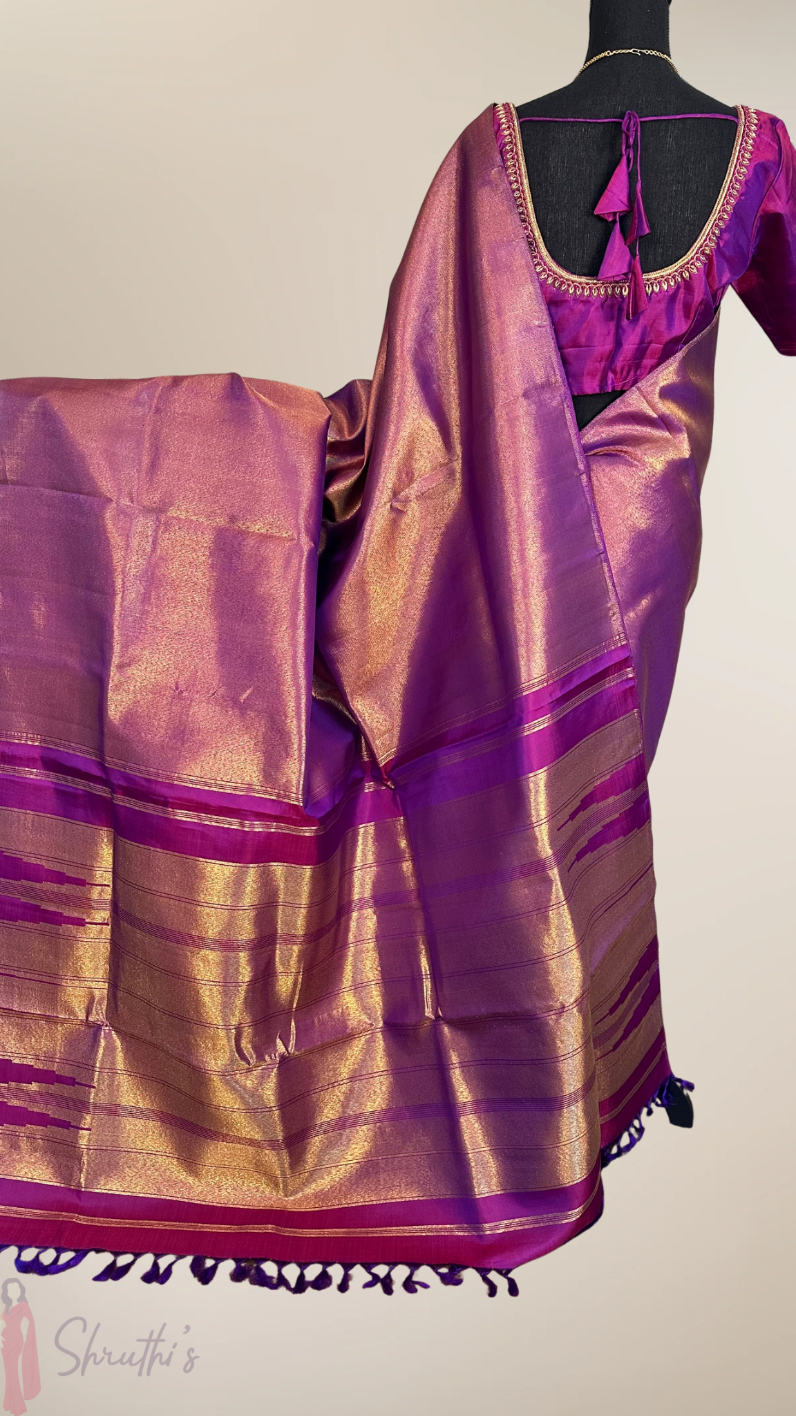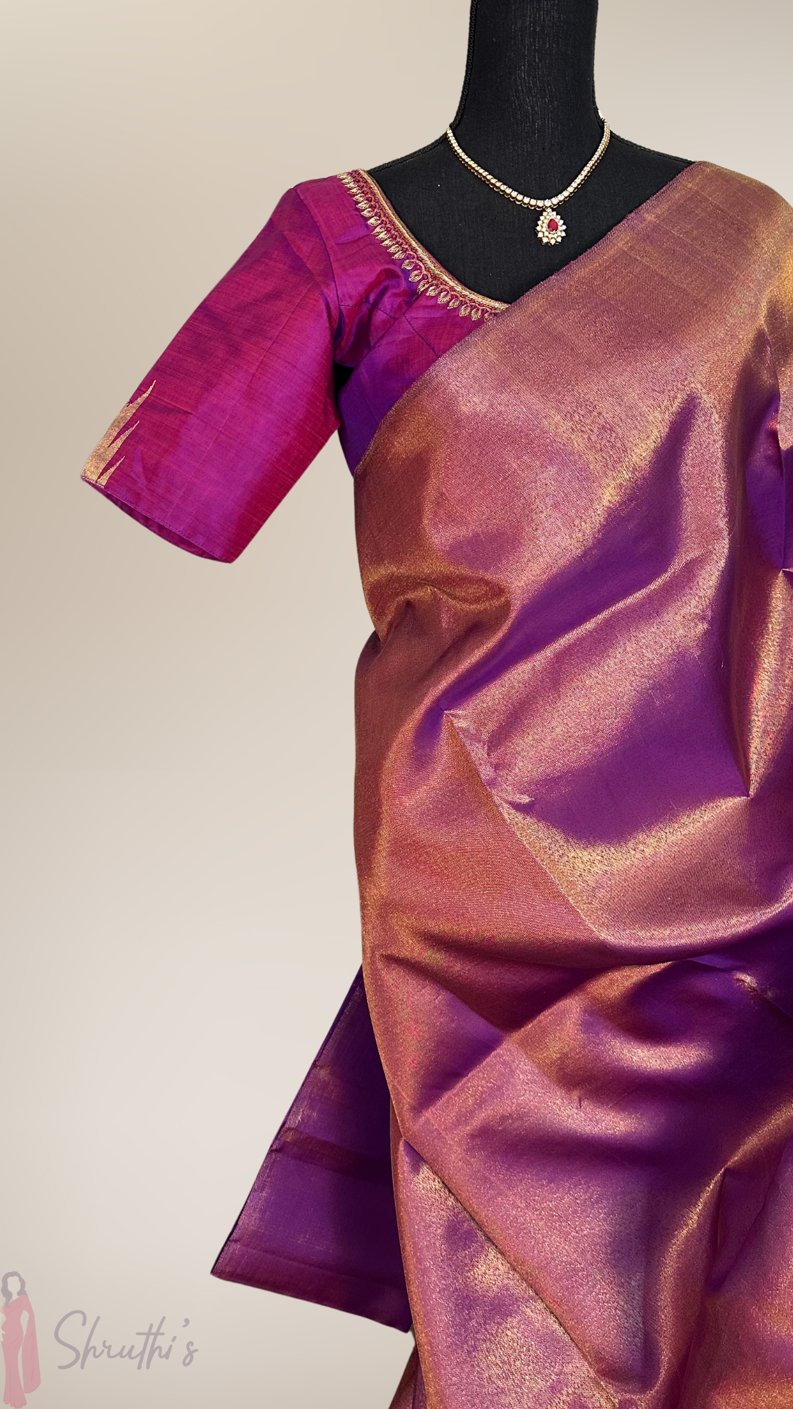Craft Description: Handwoven Kanjivaram silk saree with zari borders & embroidery blouse