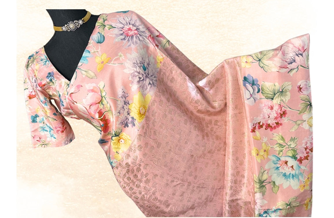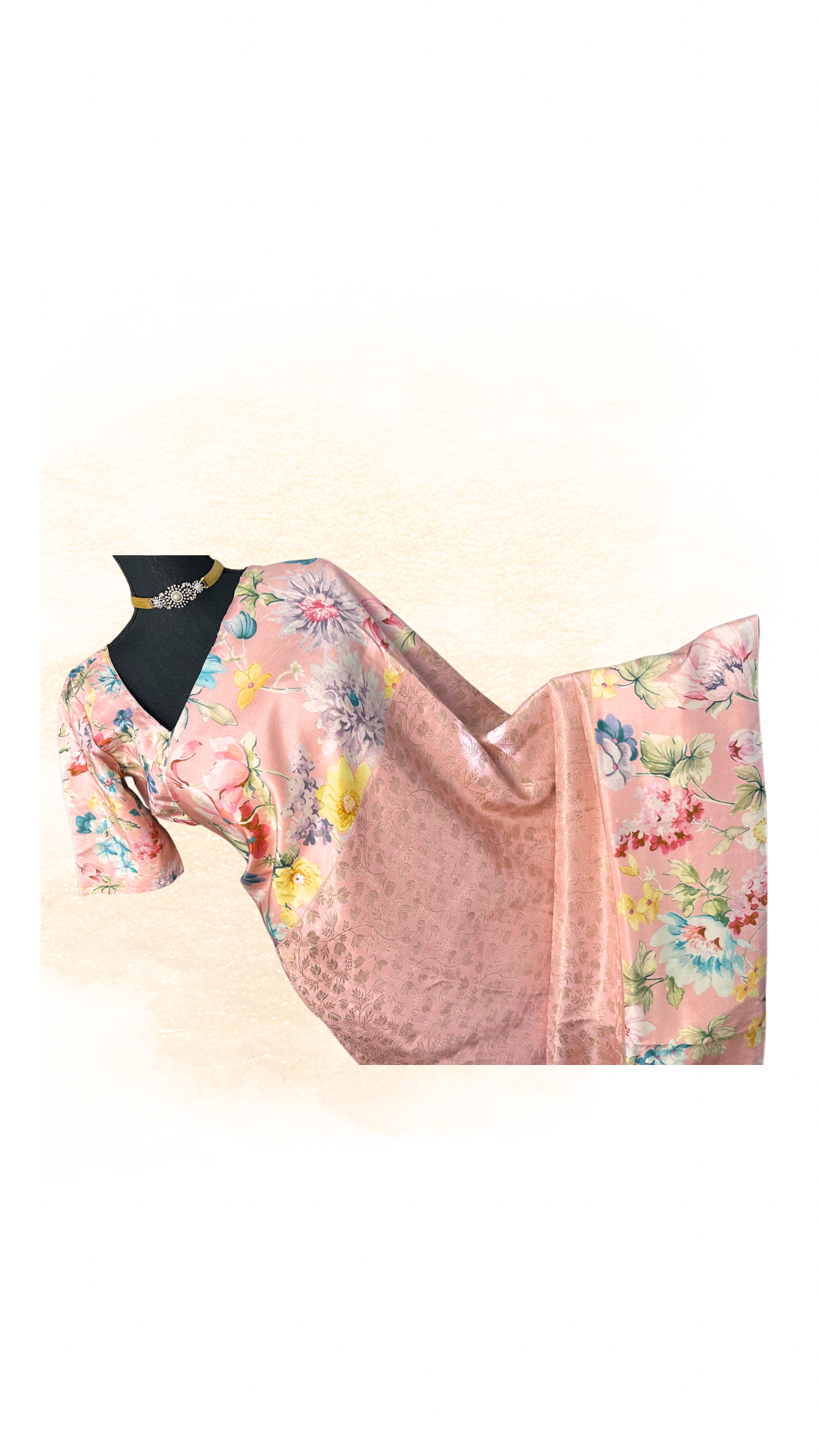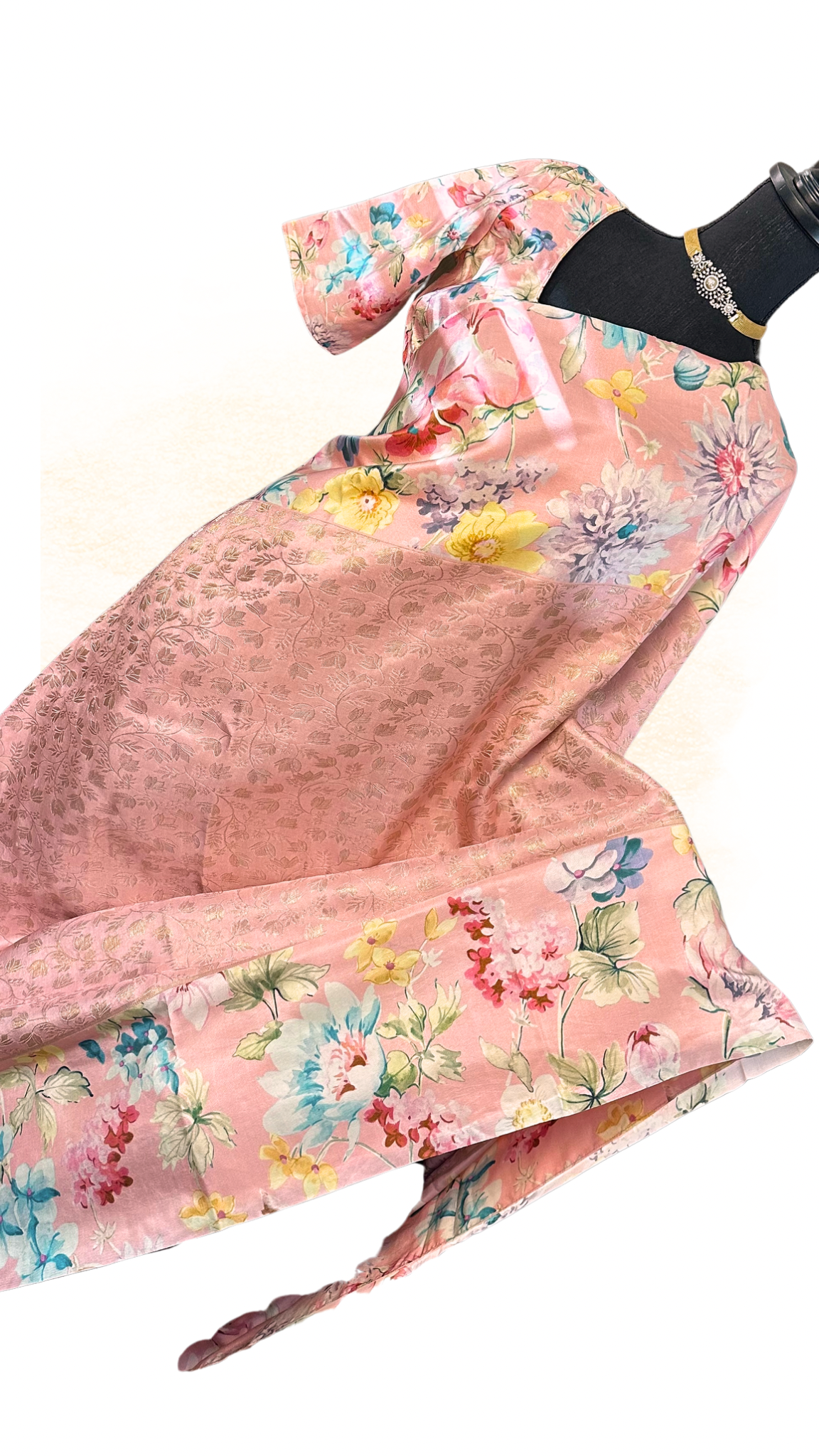 Introducing the Brocade Kanjivaram saree, a fusion of pure silk and traditional craftsmanship. This candy pink saree features intricate hand embroidery with silver and gold zari, adding a touch of elegance to any occasion. Stitched blouse included. Elevate your style with this stunning new addition to your wardrobe.