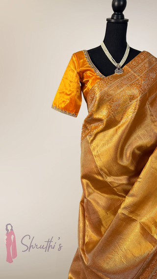 Yellowish Orange color vaira oosi silver zari Pure KANJIVARAM SAREE with Hand embroidered blouse Meenakari borders