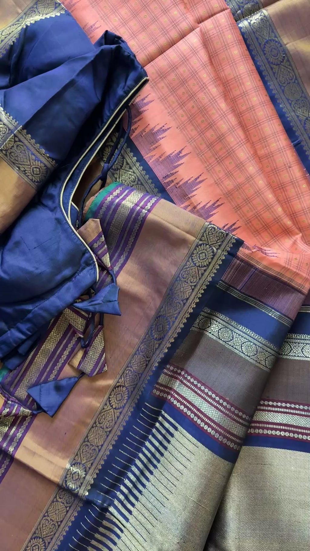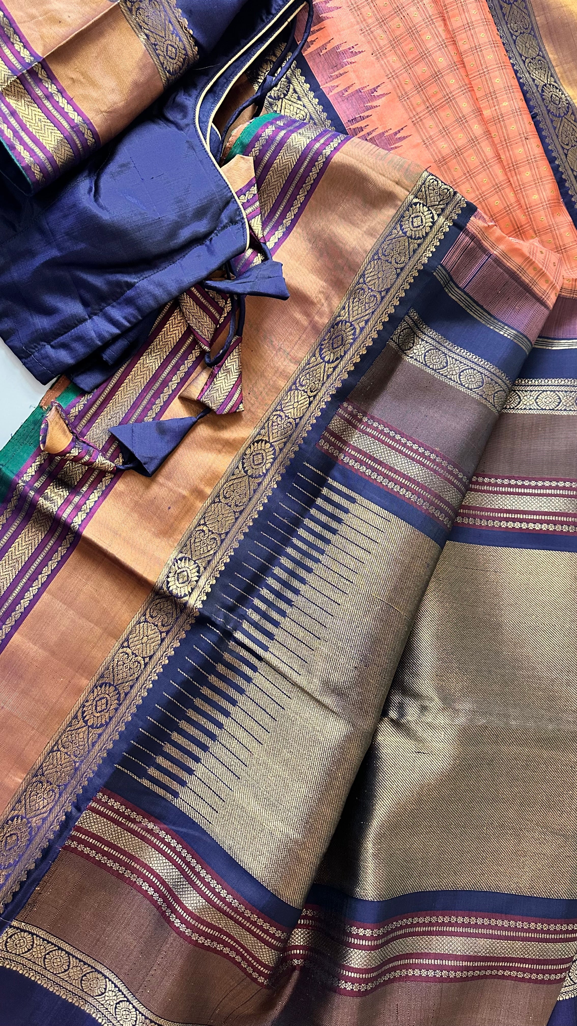 Pure zari handwoven vintage weaves checks kanjivaram silk saree Orange kankambaram handwoven pure sari Kai korvai patti saree pure silk saree with fully stitched blouses well made blouses kanjivaram silk